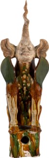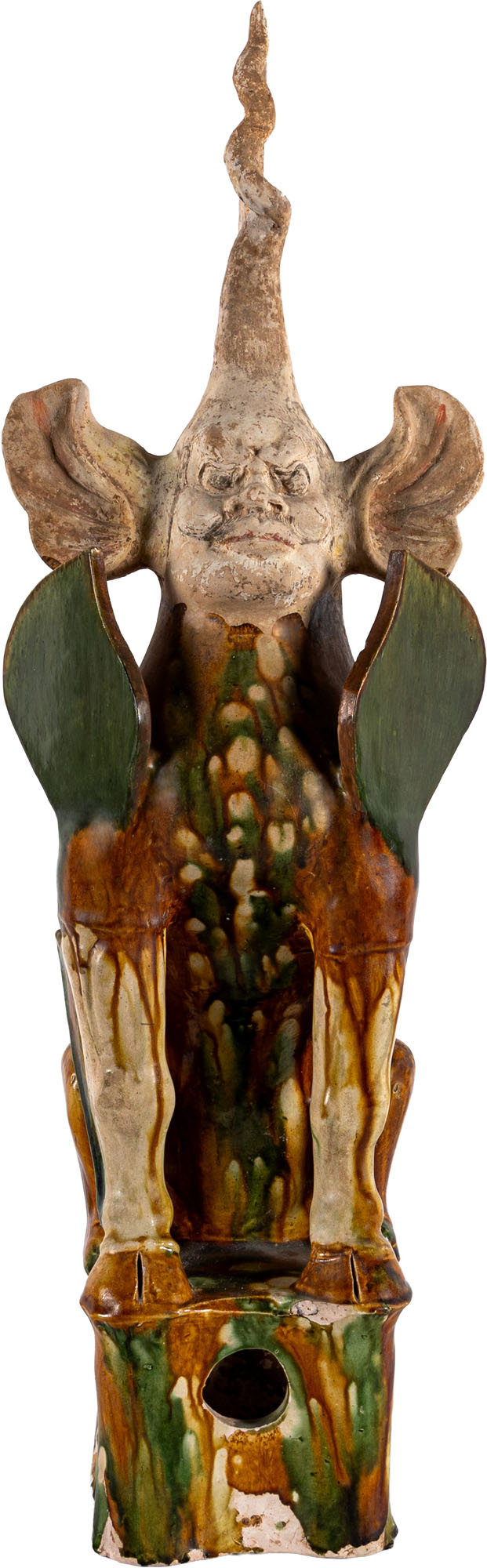 Il corpo dell'animale fantastico è in terracotta a pasta chiara a invetriatura sancai (a tre colori). La testa è dipinta a freddo.