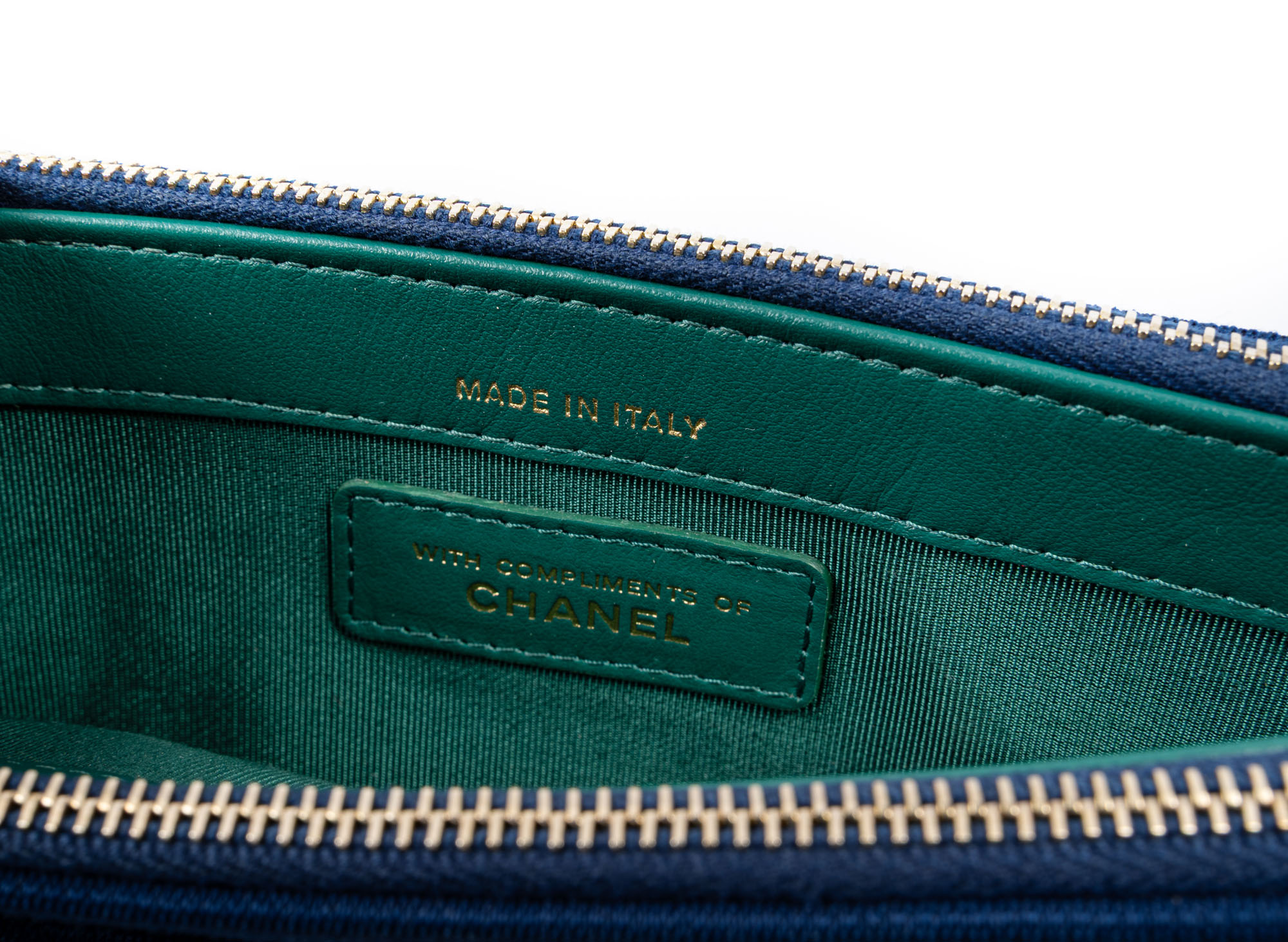 In blu matelassé jersey, pelle e dettagli in metallo dorato