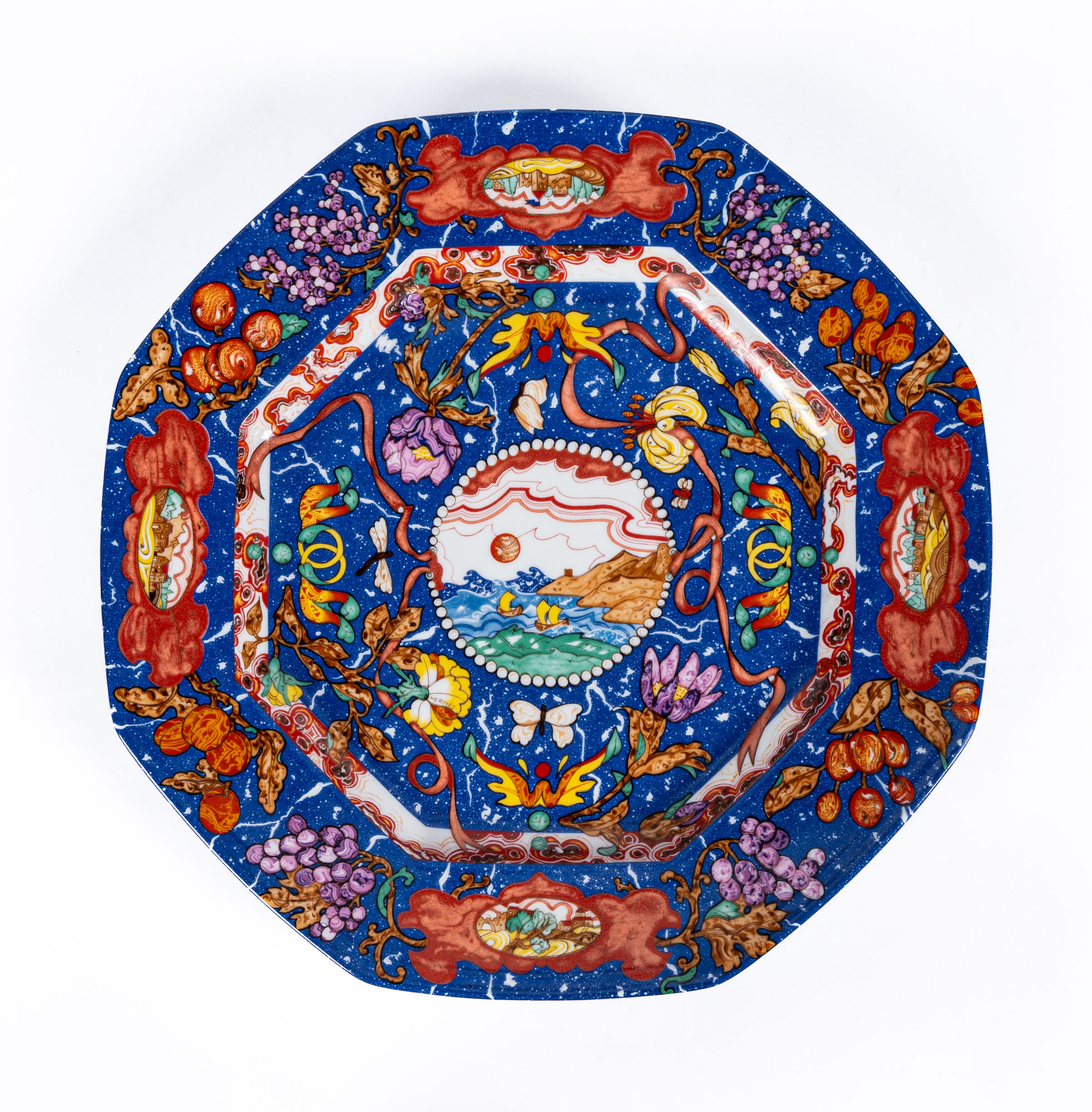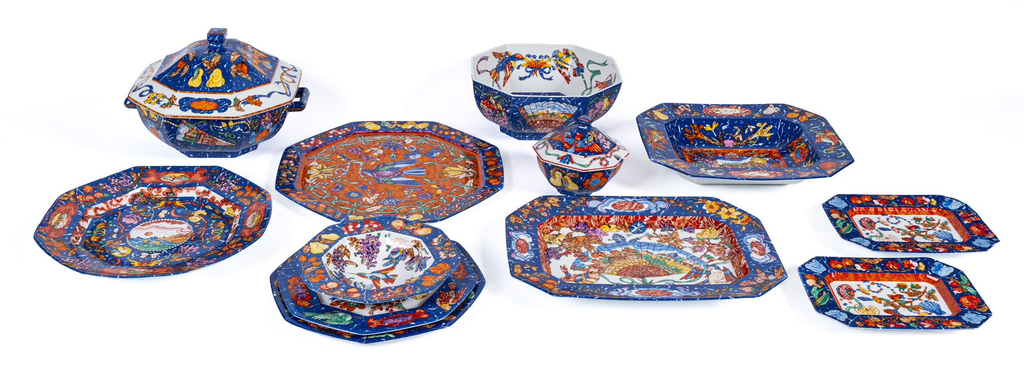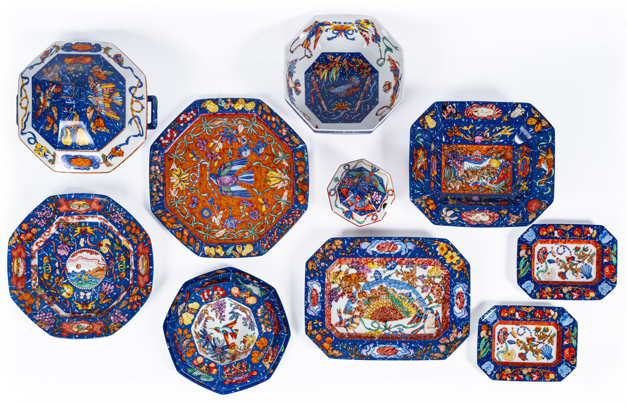 Il servizio per 8 persone conta 40 pezzi ed è così composto: 8 piatti fondi, 8 sottopiatti, 8 piatti piani, 1 zuppiera con coperchio, 1 insalatiera, 2 piccoli vassoi rettangolari, 1 formaggera ottagonale con coperchio, 1 piatto rettangolare da portata, 1 piatto ottagonale da portata, 1 piatto ottagonale da dolci.