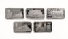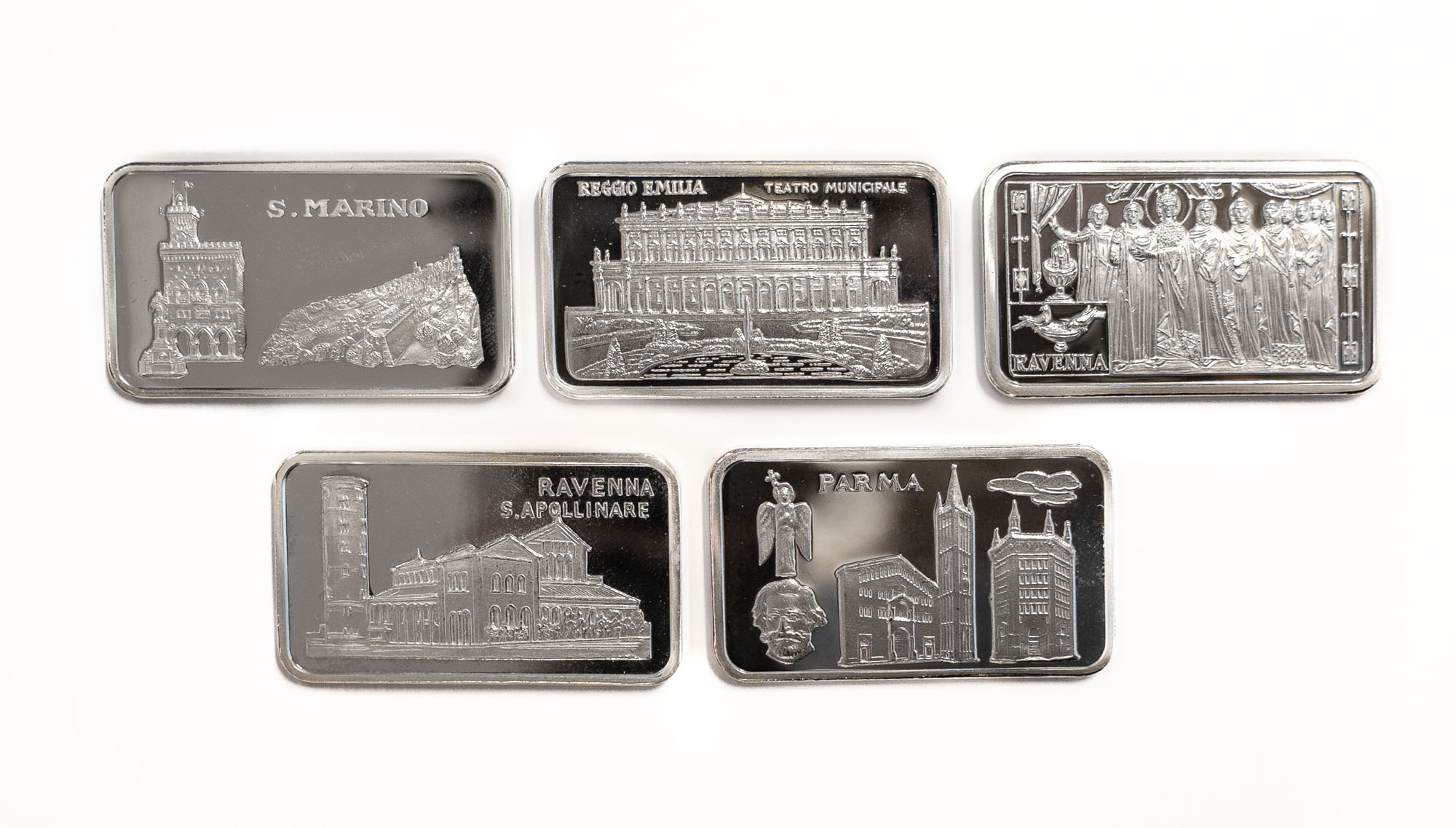 Serie di 5 placche da 31 gr l'una in argento 999 raffiguranti: San Marino, Ravenna, Ravenna S. Apollinare, Reggio Emilia il teatro Municipale, Parma.