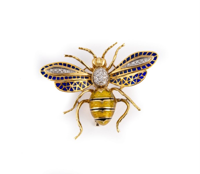 Spilla in oro giallo 18kt a forma di ape impreziosita da smalto policromo e diamanti taglio huit-huit per ct 0.30 ca
