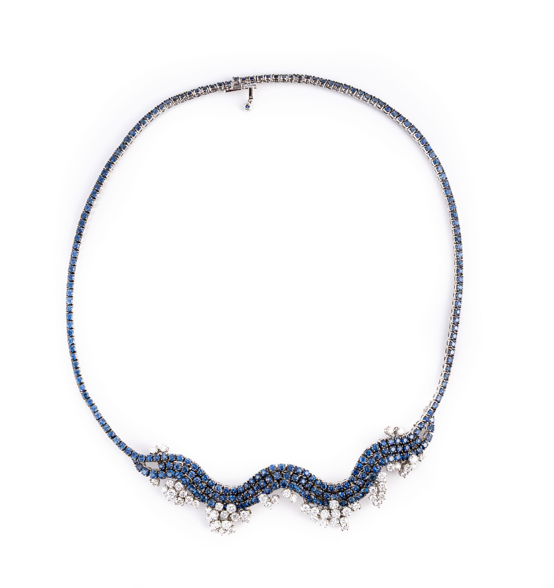 Collana girocollo semirigida in oro bianco 18kt impreziosita da zaffiri taglio rotondo per ct 17.00 ca e diamanti taglio brillante per ct 4.05 ca.
