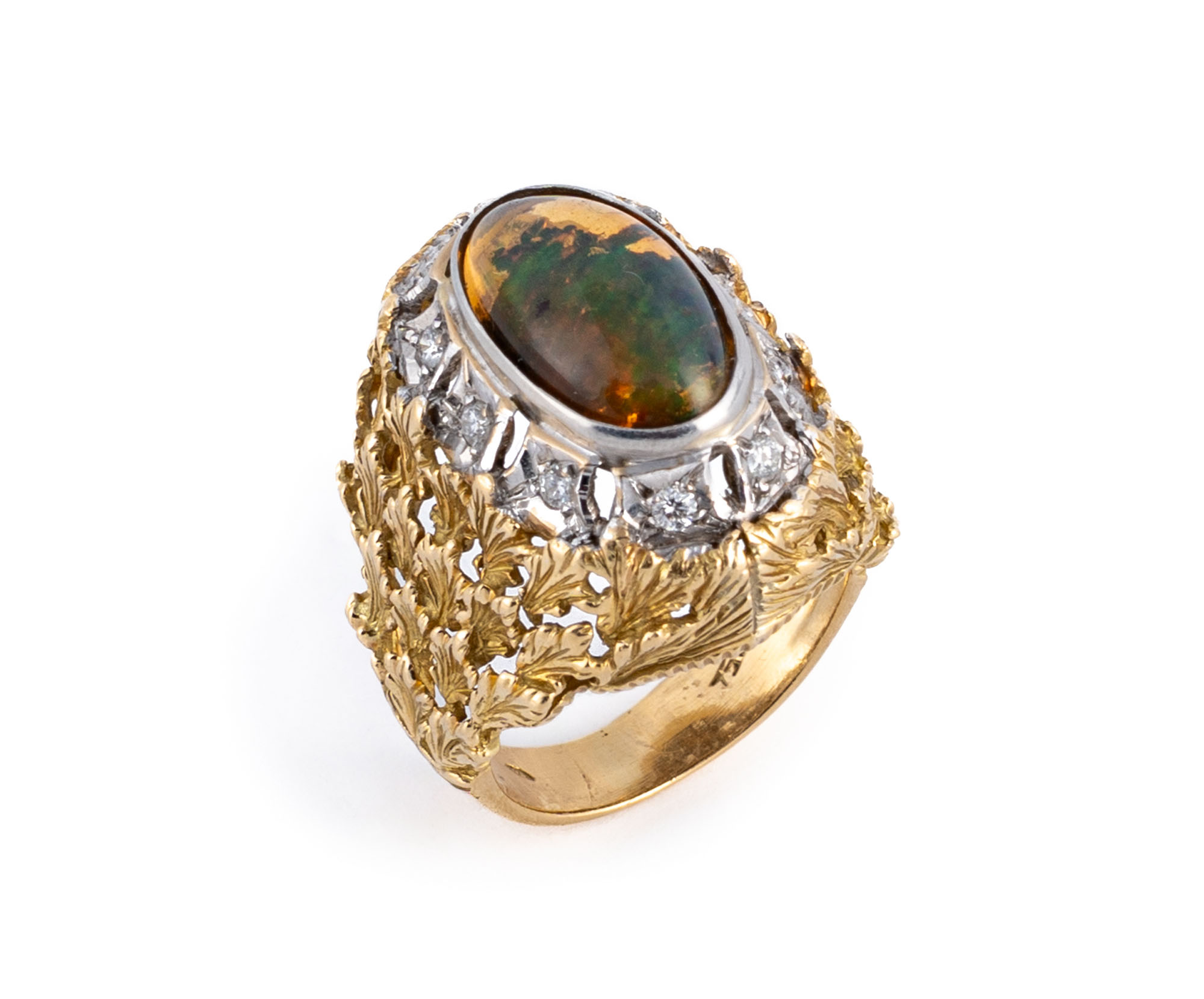 Anello in oro bicolore 18kt con gambo inciso a motivi vegetali a traforo, impreziosito da un opale scuro ovale taglio cabochon di ct 2.51 ca contornato da diamanti taglio brillante per ct 0.2 ca