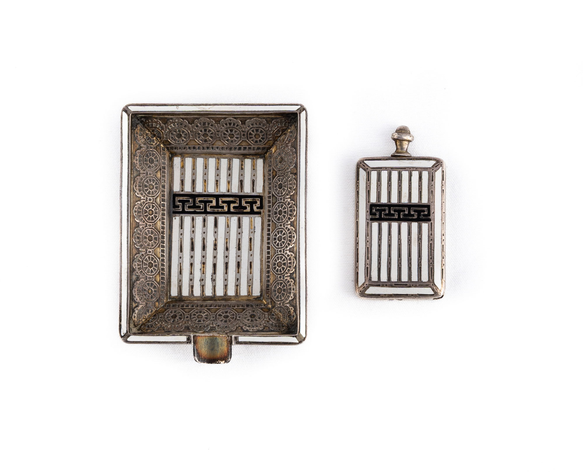 Piccolo posacenere e accendino dotato di uno stoppino. Entrambi con dettagli in smalto a righe bianche e nere