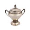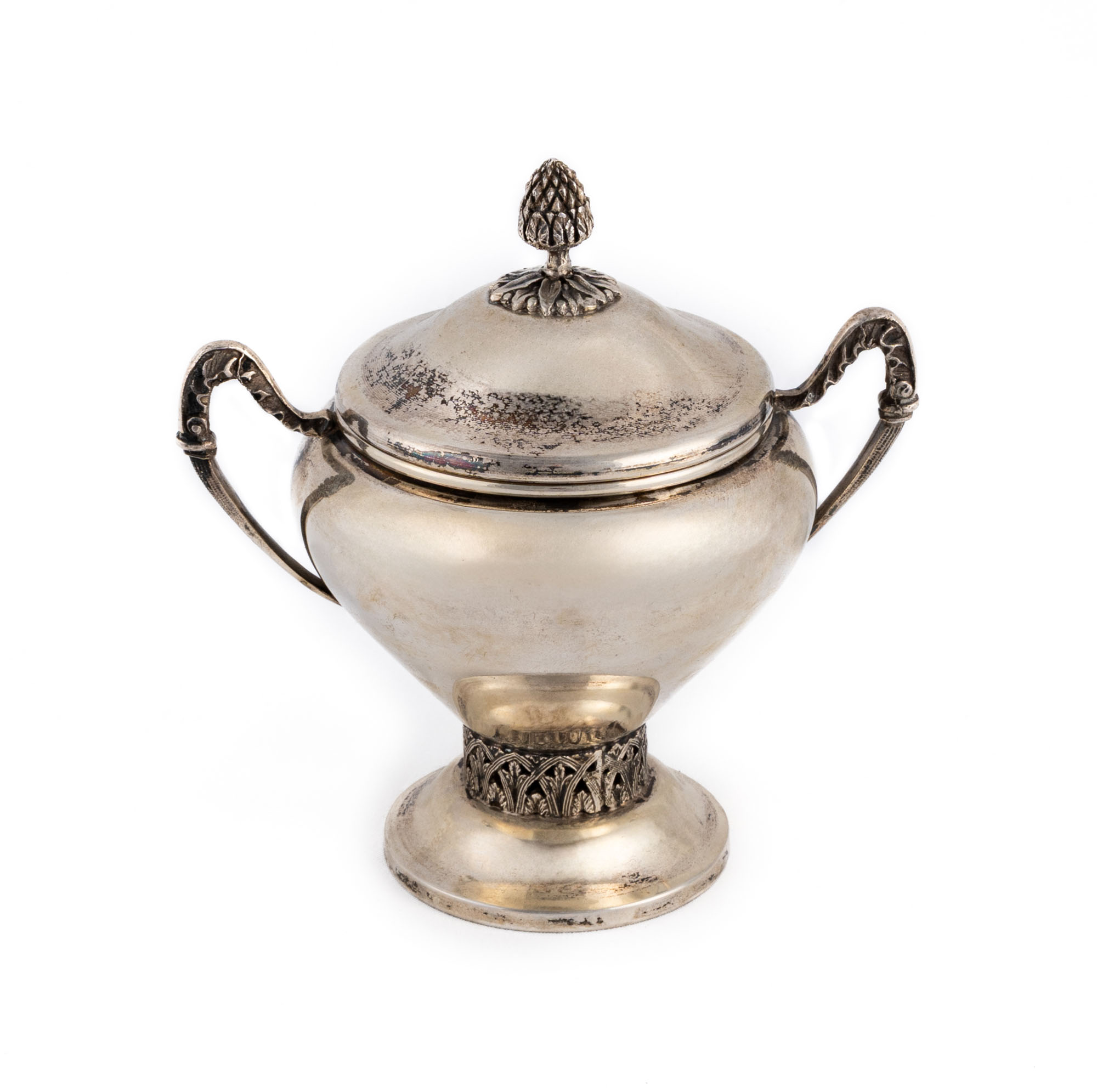 A forma di coppa con base a piedistallo decorati a motivi floreali e geometrici, anse laterali ricurve. Coperchio a cupolino sormontato da un pomello a forma di pigna