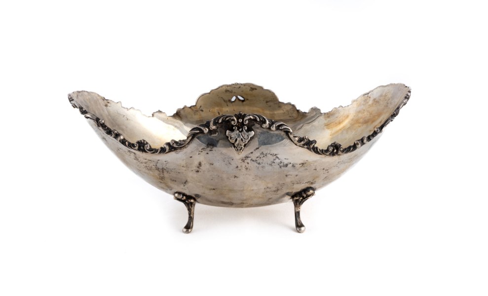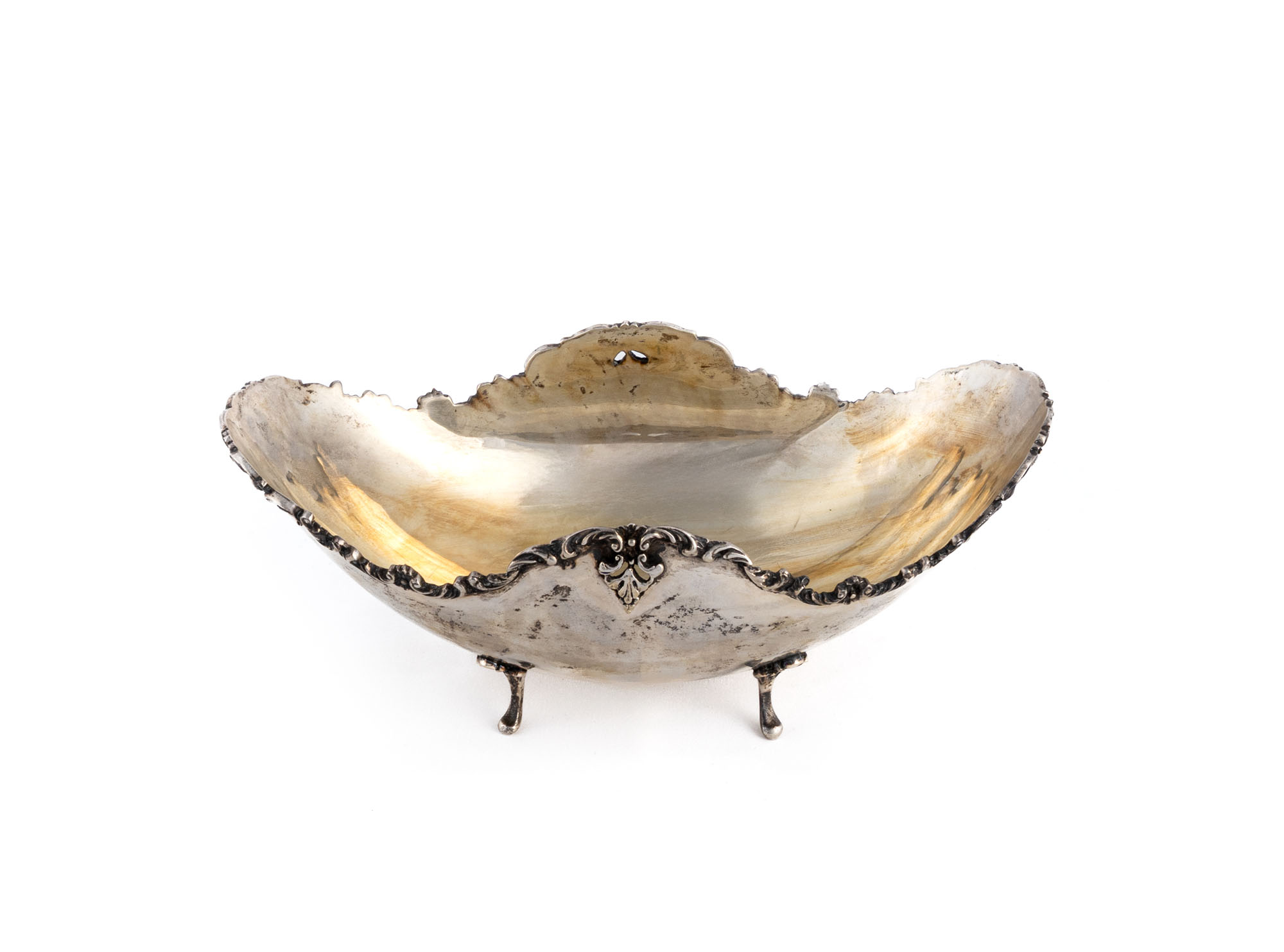 Di forma ovale dal bordo ondulato e decorazioni a sbalzo