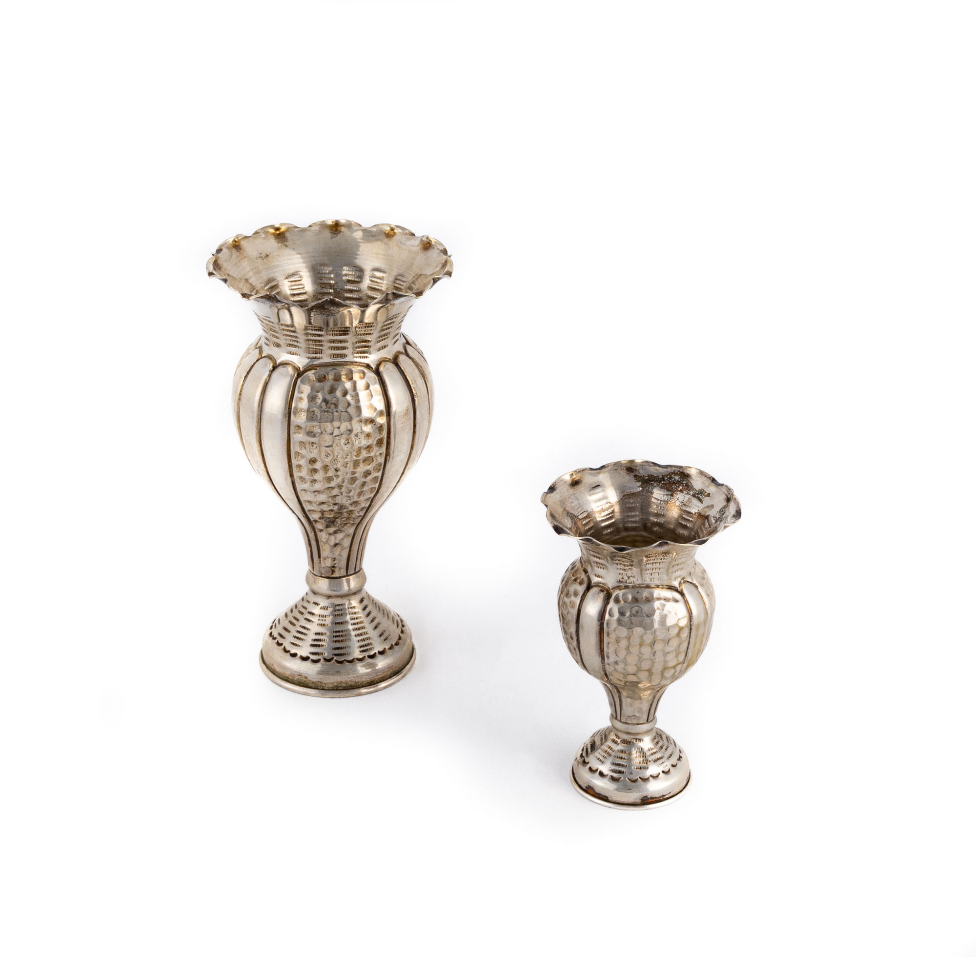 Lotto composto da due piccoli vasi in argento di altezze diverse La parte superiore svasata con bordo ondulato
