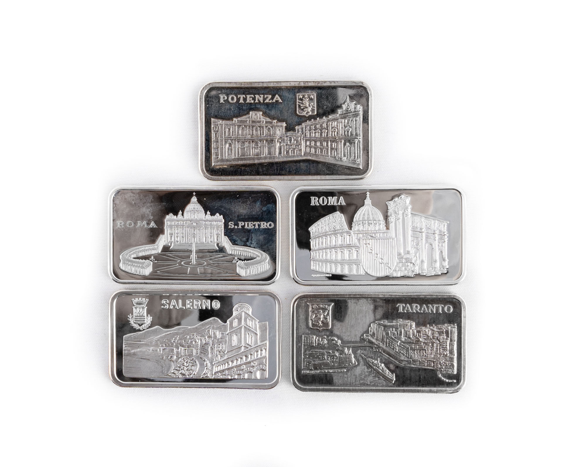 Serie di 5 placche da 31 gr l'una in argento 999 raffiguranti: Roma San Pietro, Roma, Salerno, Taranto e Potenza