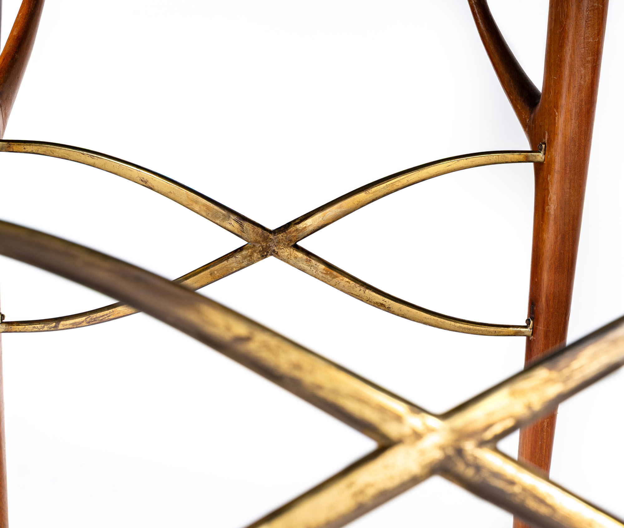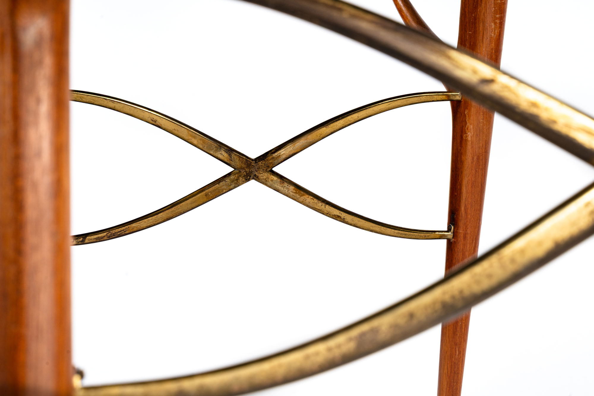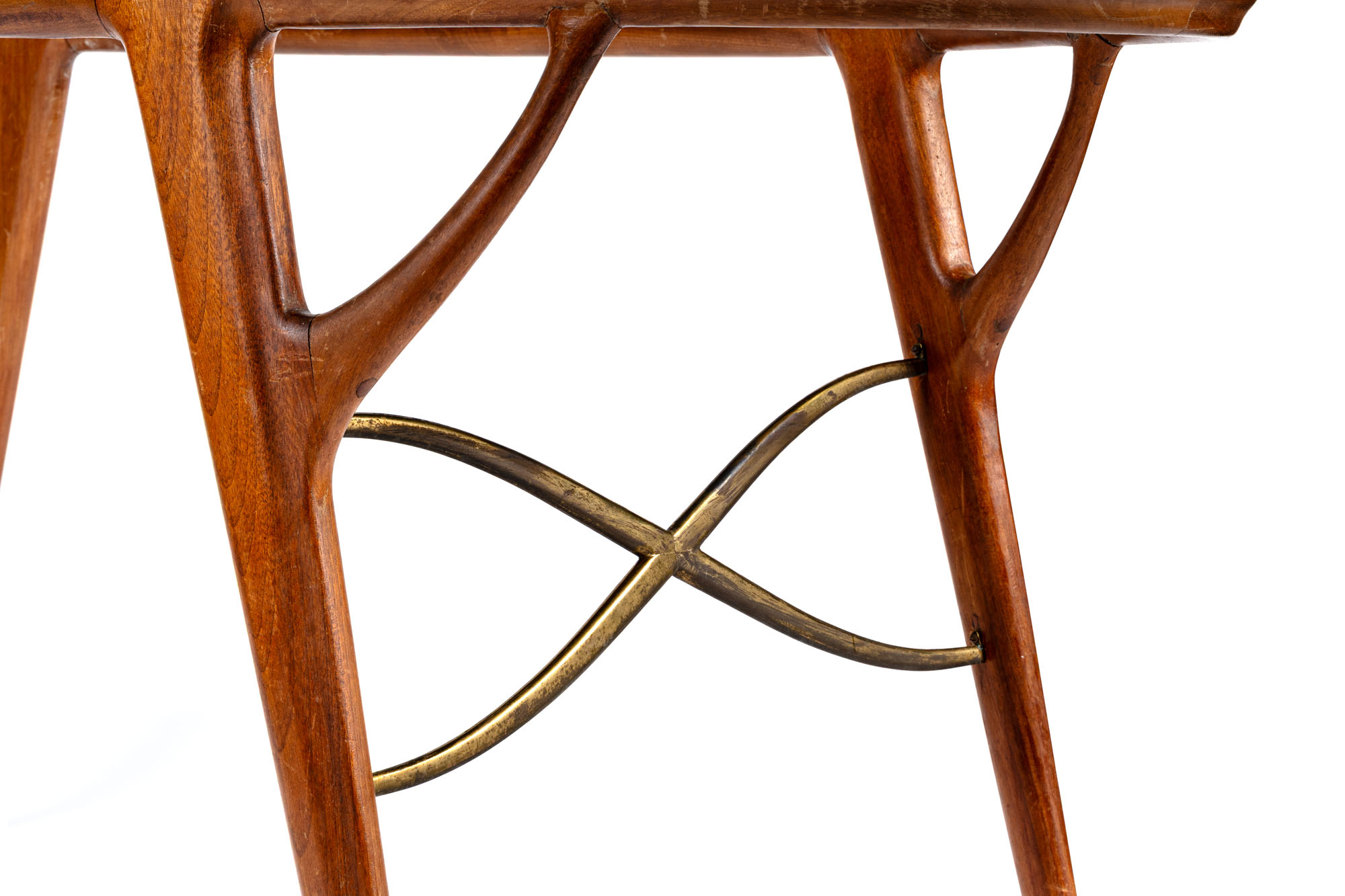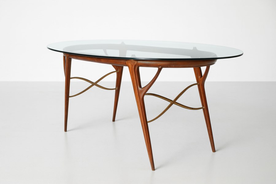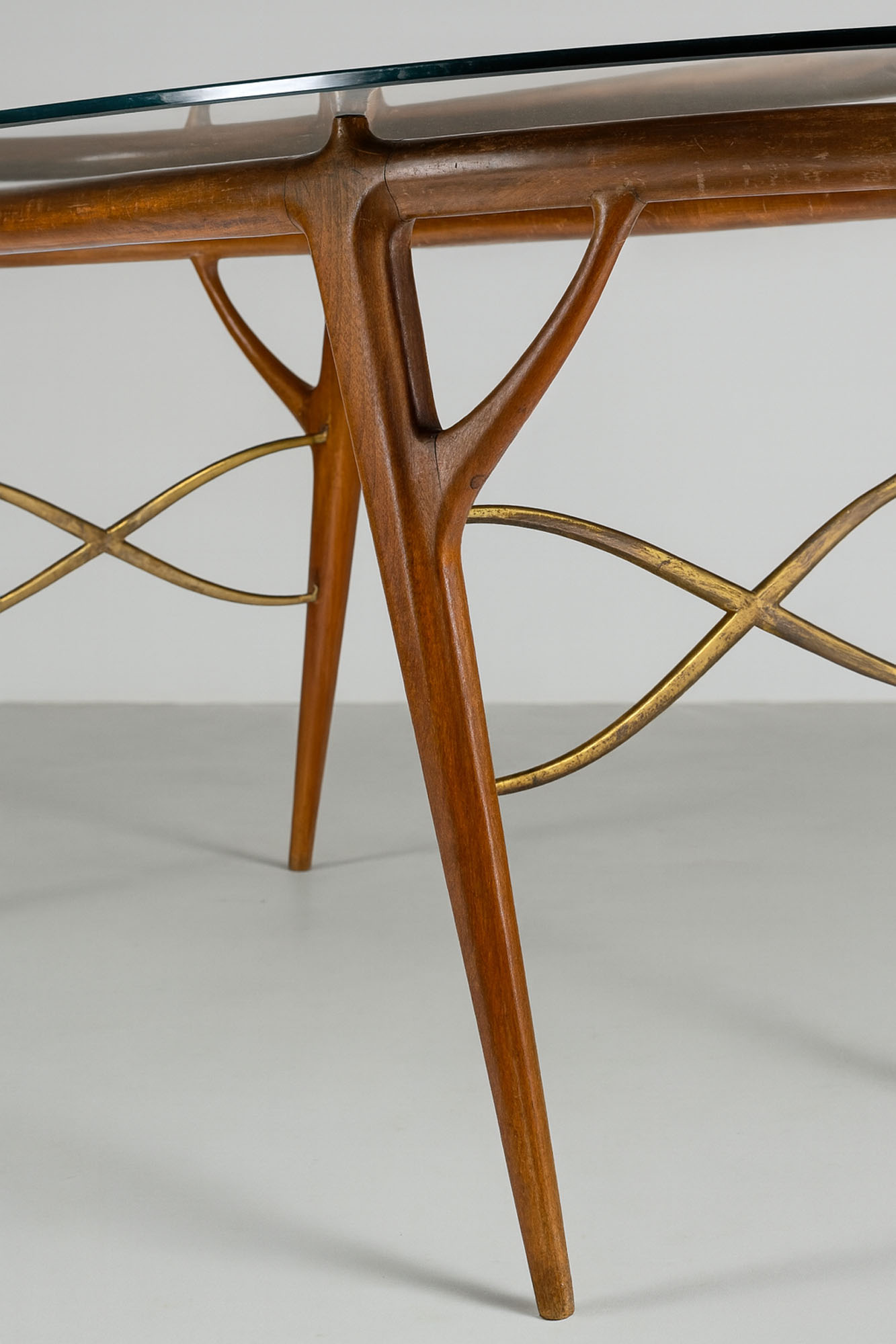 Tavolo con struttura in legno e dettagli in fusione di ottone. Piano in cristallo molato, produzione Italia, 1950 circa