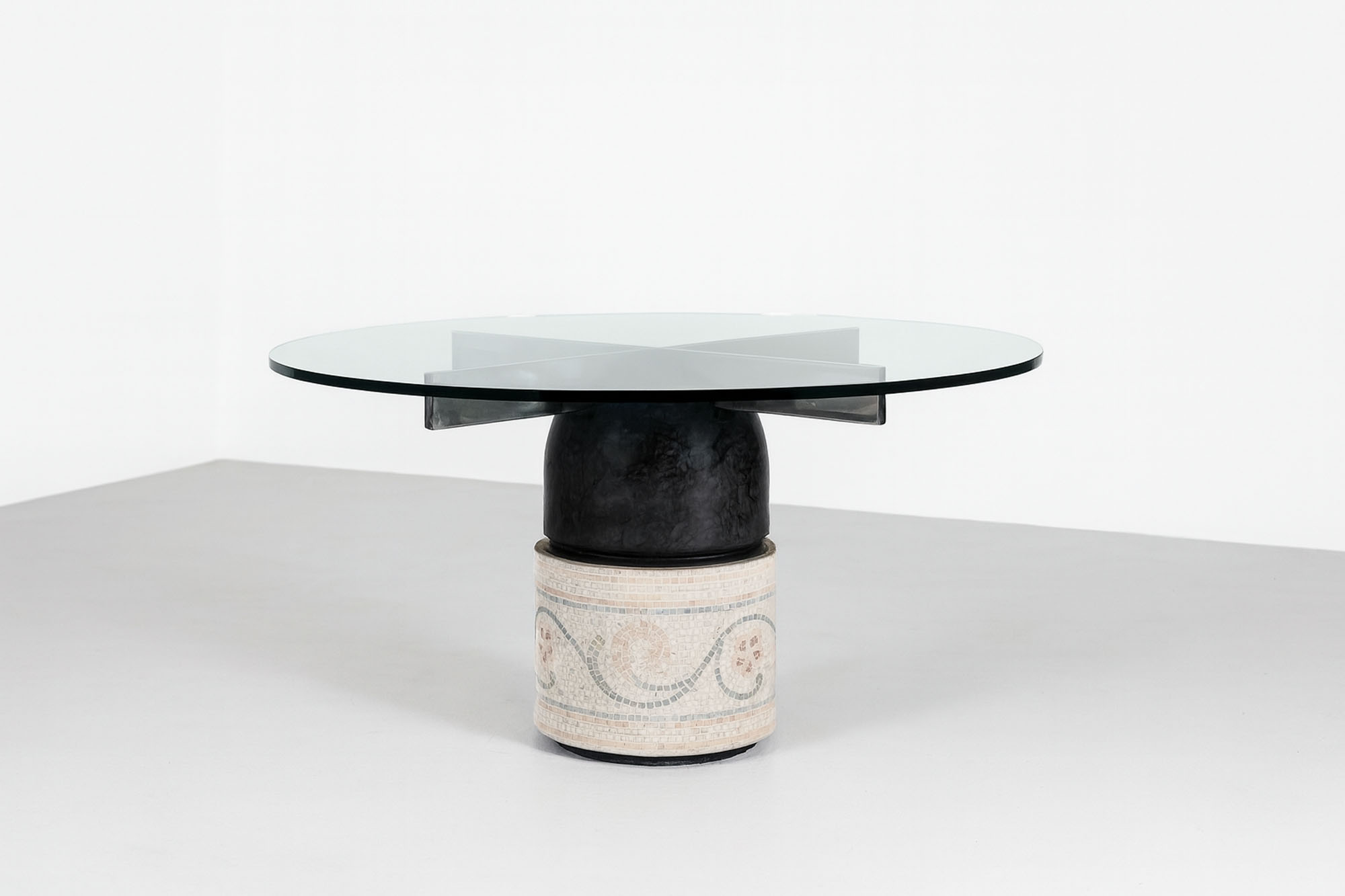 Base in calcestruzzo rivestita in mosaico, struttura in acciaio cromato e piano in vetro, produzione Saporiti Italia, 1970 circa