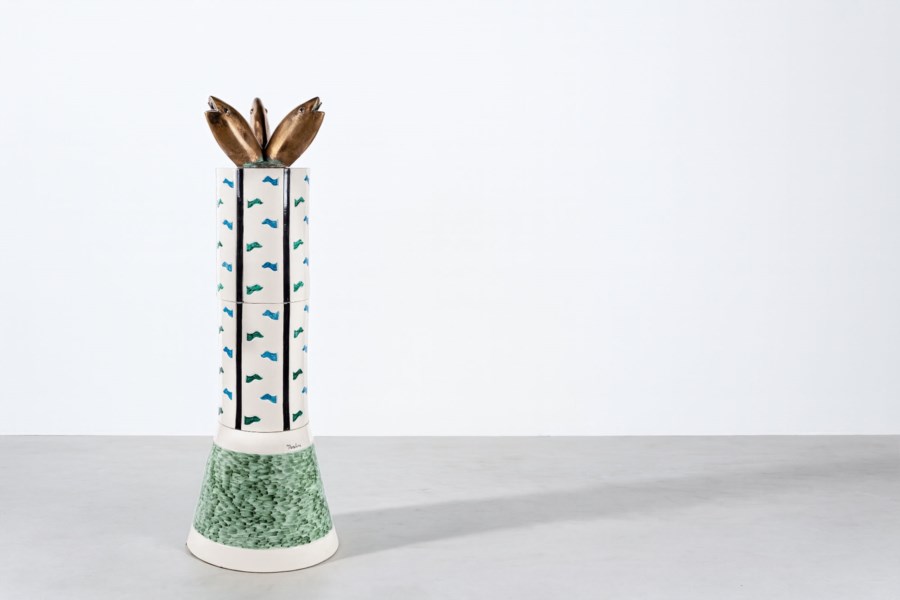 Scultura modulare in ceramica smaltata con innesto in bronzo, produzione Mirabili - Arte d'Abitare, Italia, 1986