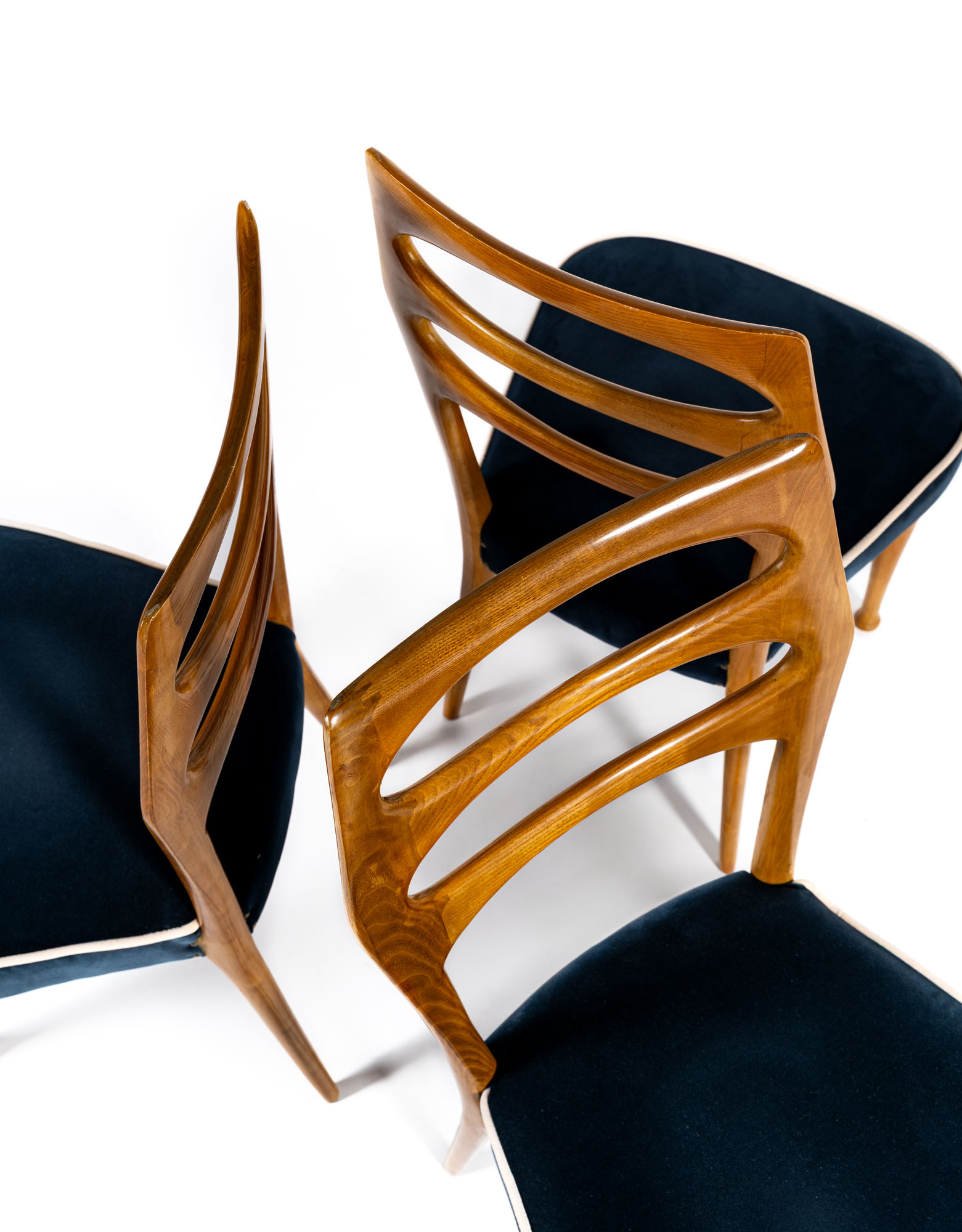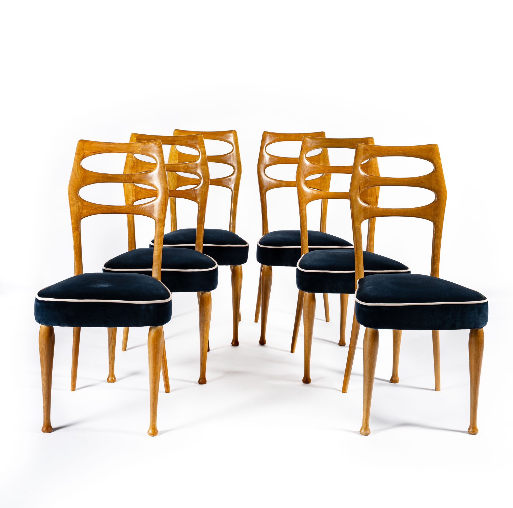 Struttura in frassino, seduta in velluto blu con profili a contrasto color avorio, produzione Italia, 1950 circa