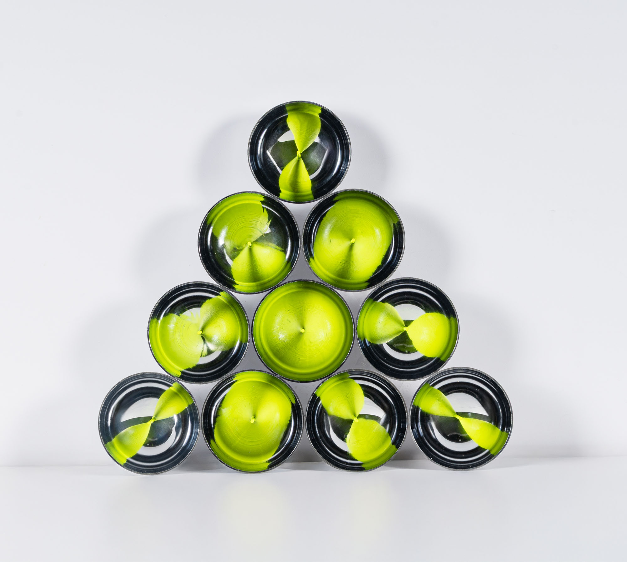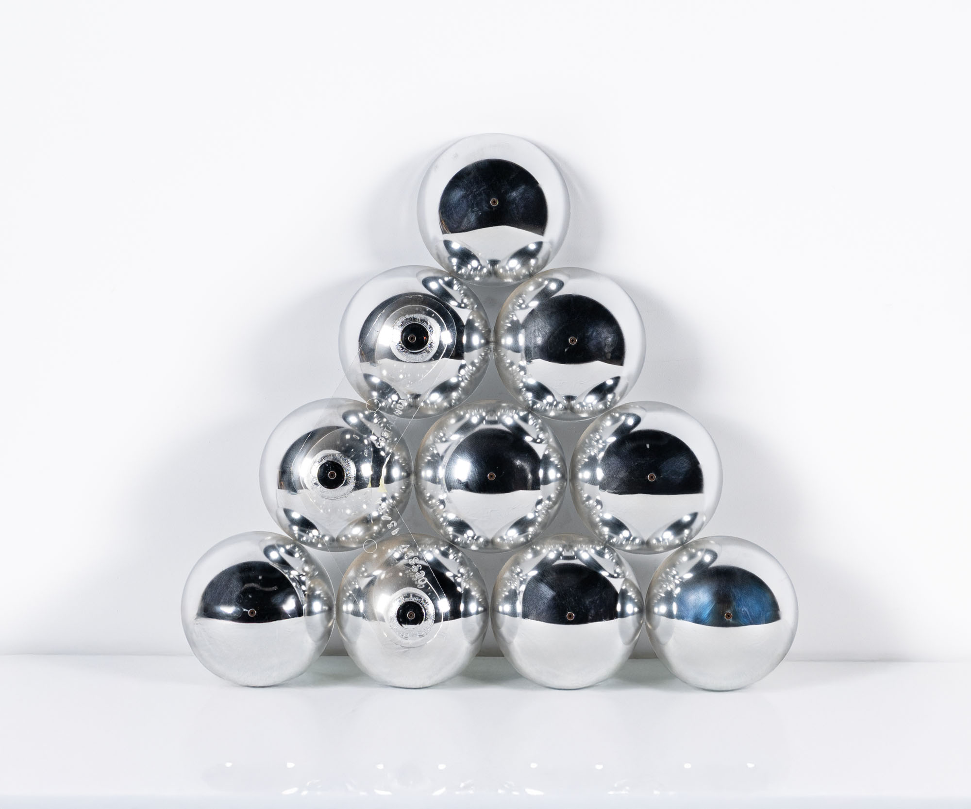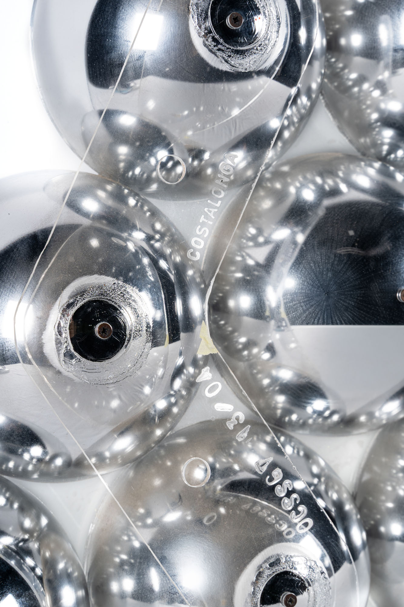 Scultura composta da dieci semisfere in metacrilato metallizzato su plexiglas