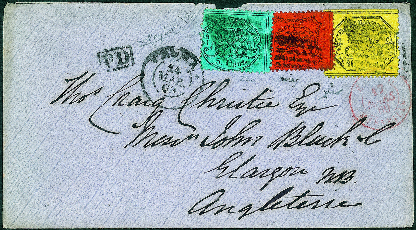 Antichi Stati Italiani - Stato pontificio - Affrancature tricolore per la Scozia su bustina da Roma 24 MAR.69