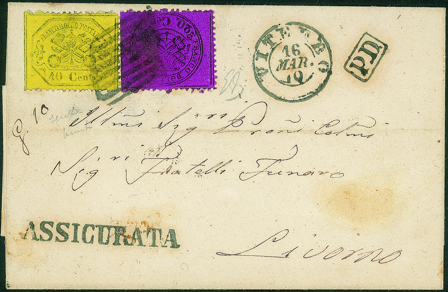 A Livorno con 20 cent solferino + 40 cent giallo limone (28 + 29 cat.605) con bollo P.D. e lineare ASSICURATA - firma ED