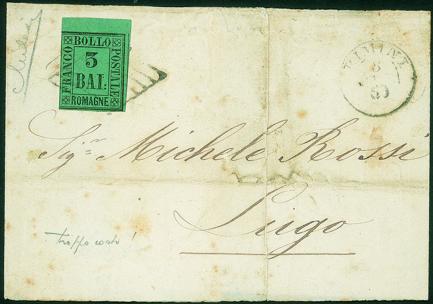Corto da un lato e bordo di foglio in alto con annullo a griglia + doppio cerchio Rimini 8 _ 60 per Lugo - cert. Luigi Gazzi