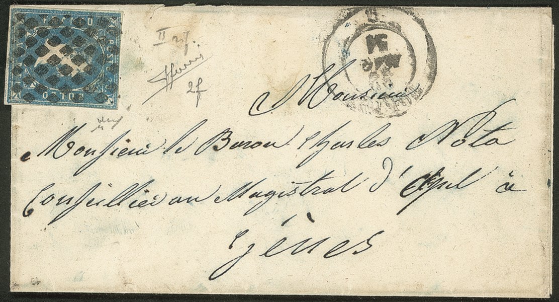 Antichi Stati Italiani - Sardegna - Piccola lettera affrancata con 20 cent azzurro chiaro da Torino 22 MAG.51 per Genova