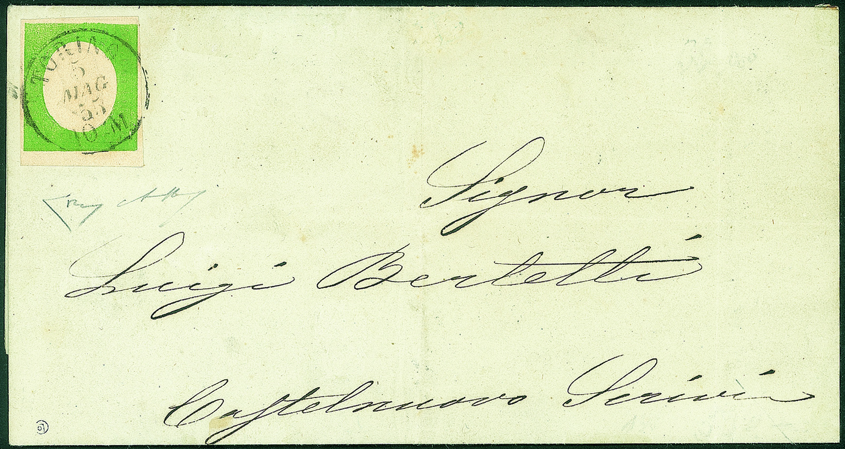 Lettera circolare affrancata con 5 cent verde giallo (7) da Torino 5 MAG.55 per Castelnuovo Scrivia - cert. Bolaffi 80% + Enzo Diena
