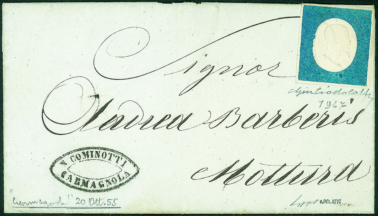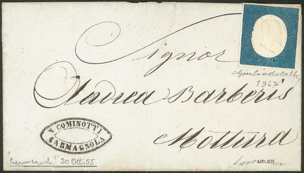 Su busta da Carmagnola 20 ottobre 1855 per Mottura - cert. Giulio Bolaffi