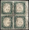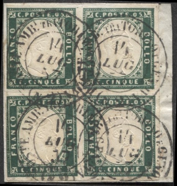 Frammento con blocco di quattro del 5 cent verde scuro annullato con doppio cerchio ambulante Torino/Genova (2) - PEZZO UNICO DI GRANDE RARITA' - AD + ED + Raybaudi - (13Ac)