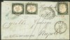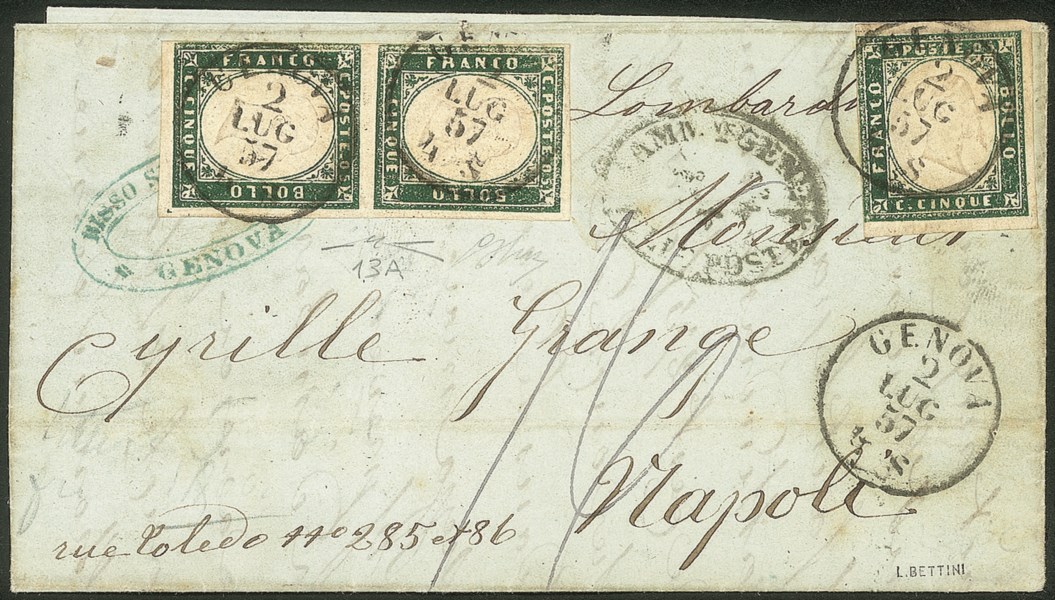 Antichi Stati Italiani - Sardegna - Lettera affrancata con coppia verticale + singolo del 5 cent verde mirto (13A)