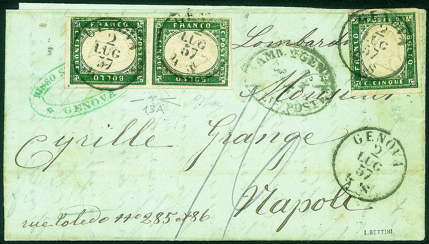 Margini perfetti - da Genova 2 LUG 57 per Napoli con il vapore Lombardo - firma Oliva + cert. Manzoni