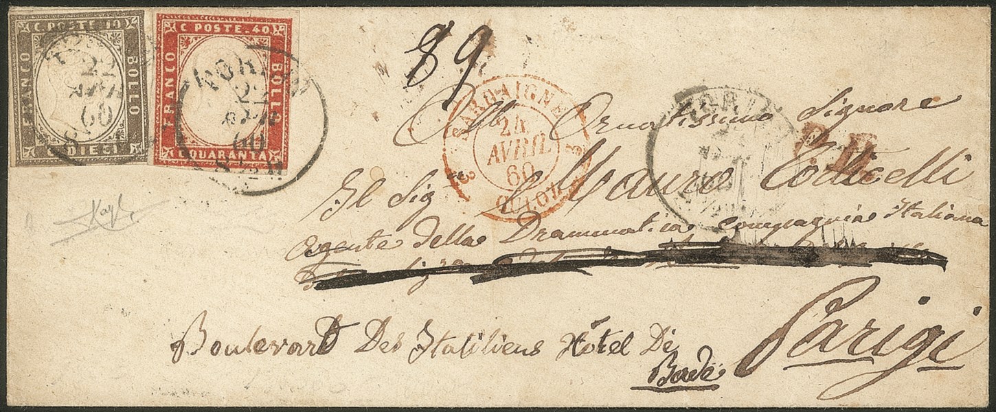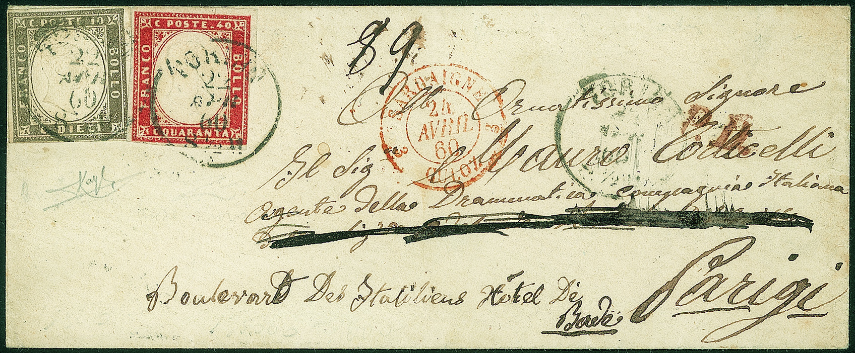Antichi Stati Italiani - Sardegna - Bustina affrancata con 10 cent bruno grigiastro + 40 cent vermiglio mattone (14Bd + 16Ba)