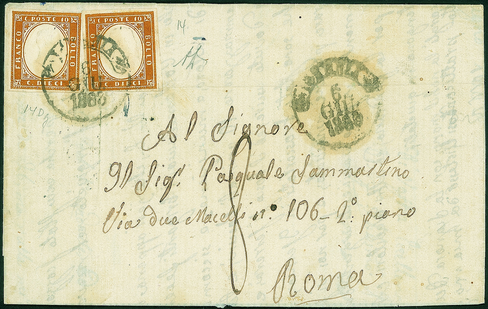 Annullati con bollo borbonico Isernia 6 GIU.1863 su lettera per Roma con tassa pontificia di 8 bajocchi - al verso annullo dell'ambulante Napoli-Isoletta molto bene impresso - firma AD