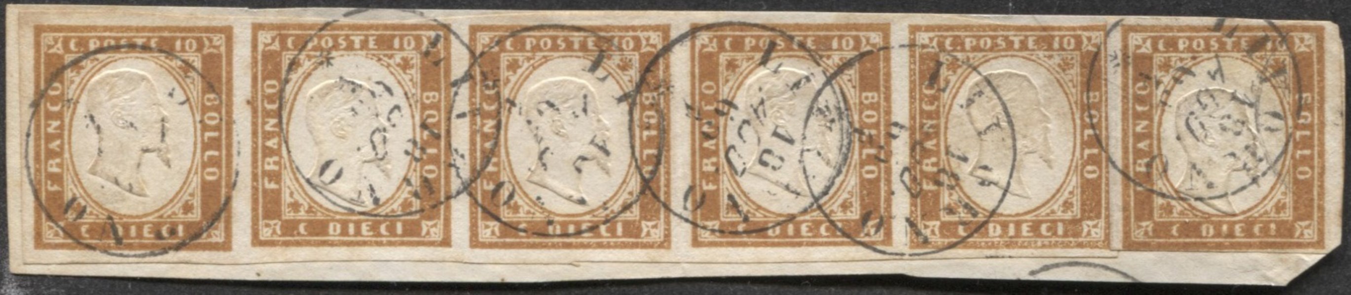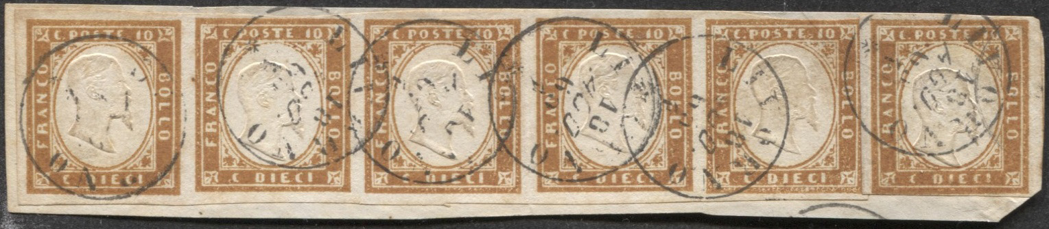 Antichi Stati Italiani - Sardegna - Frammento recante striscia di cinque più esemplare del 10 cent arancio rossastro