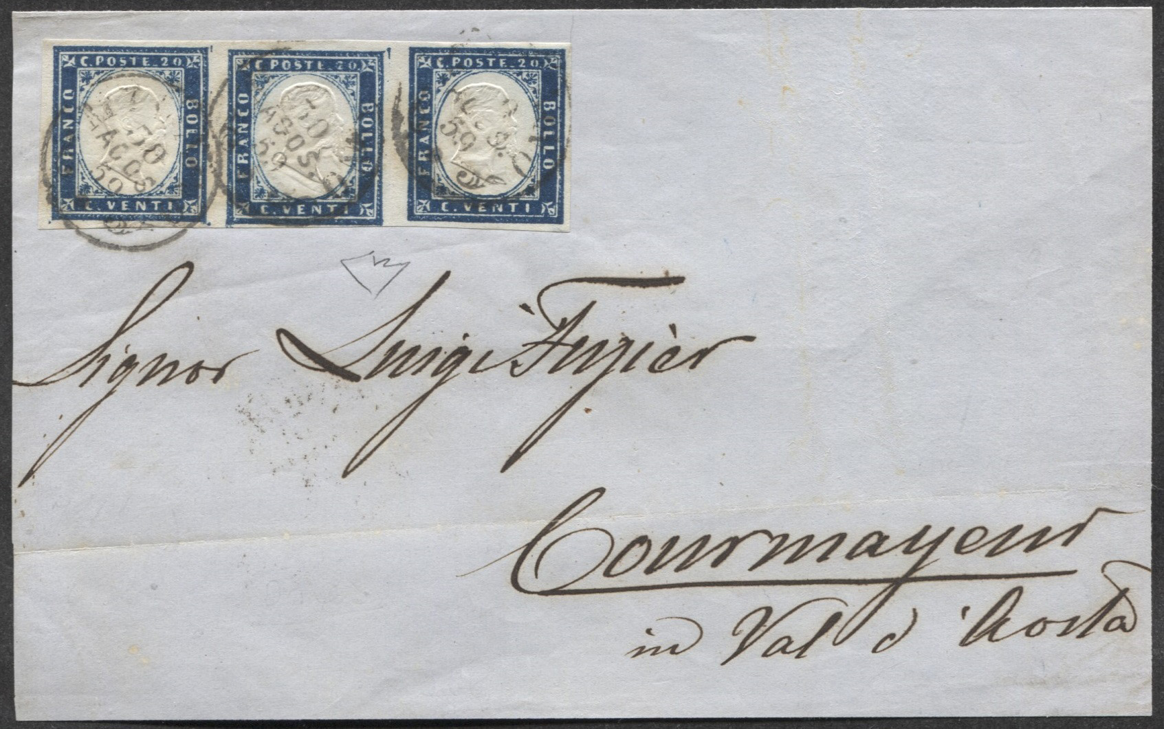 Fronte di lettera con parte del retro con annulli di transito spedita da Milano 30.8.59 (CO 59 - P.ti 13) affrancata con striscia di tre del 20 cent cobalto oltremare - ottimi margini - DI NOTEVOLE PREGIO - cert. ED - (15Ba)