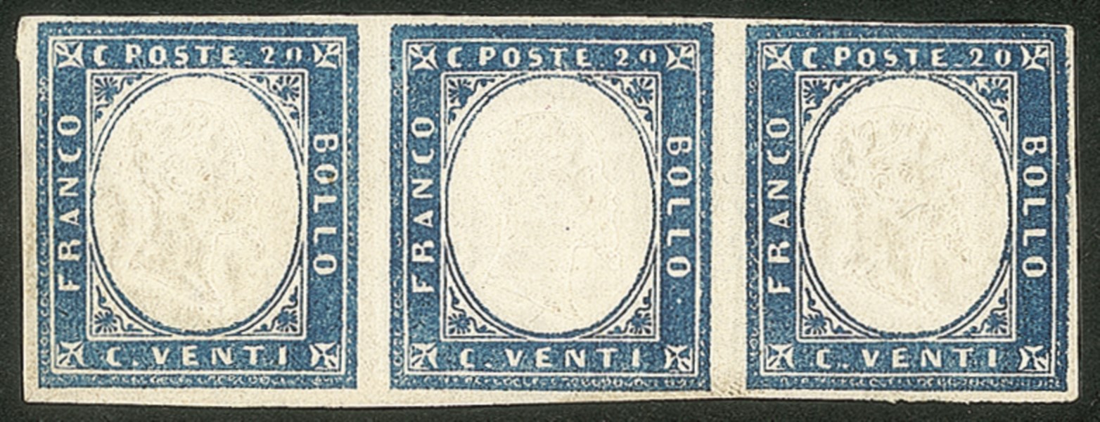 Antichi Stati Italiani - Sardegna - 1860 - striscia orizzontale di tre 20 cent azzurro (15Ca)