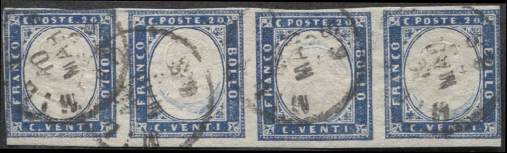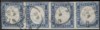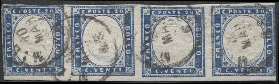Striscia di quattro del 20 cent celeste leggermente rasente in 2 punti - (15Da)