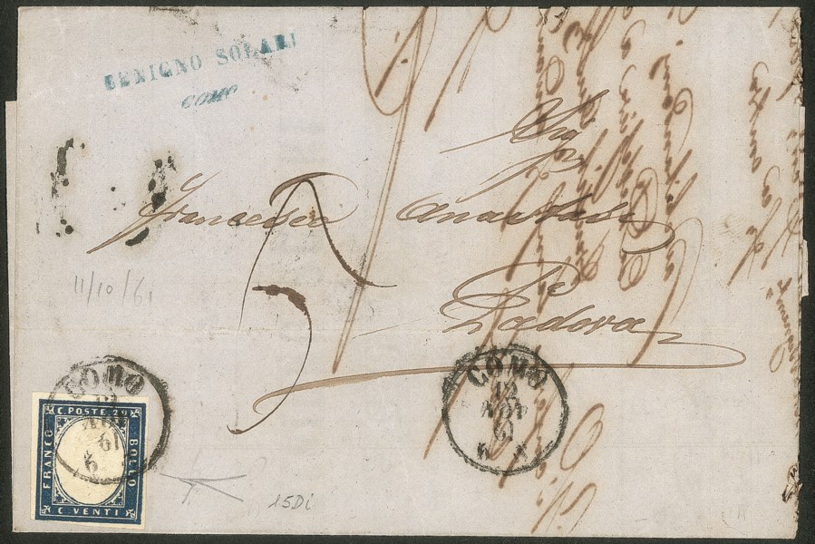 Antichi Stati Italiani - Sardegna - Lettera affrancata con 20 cent cobalto oltremare (15Di cat.3500)