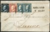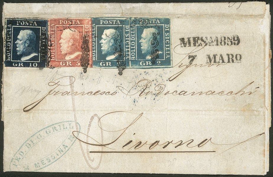 Composta da due esemplari del 2grana cobalto I tavola carta di Napoli + 5 grana rosa carminio I tavola + 10 grana azzurro cupo (6b + 9 + 12) da Messina 7 MAR del 1859 per Livorno - cert. Bottacchi