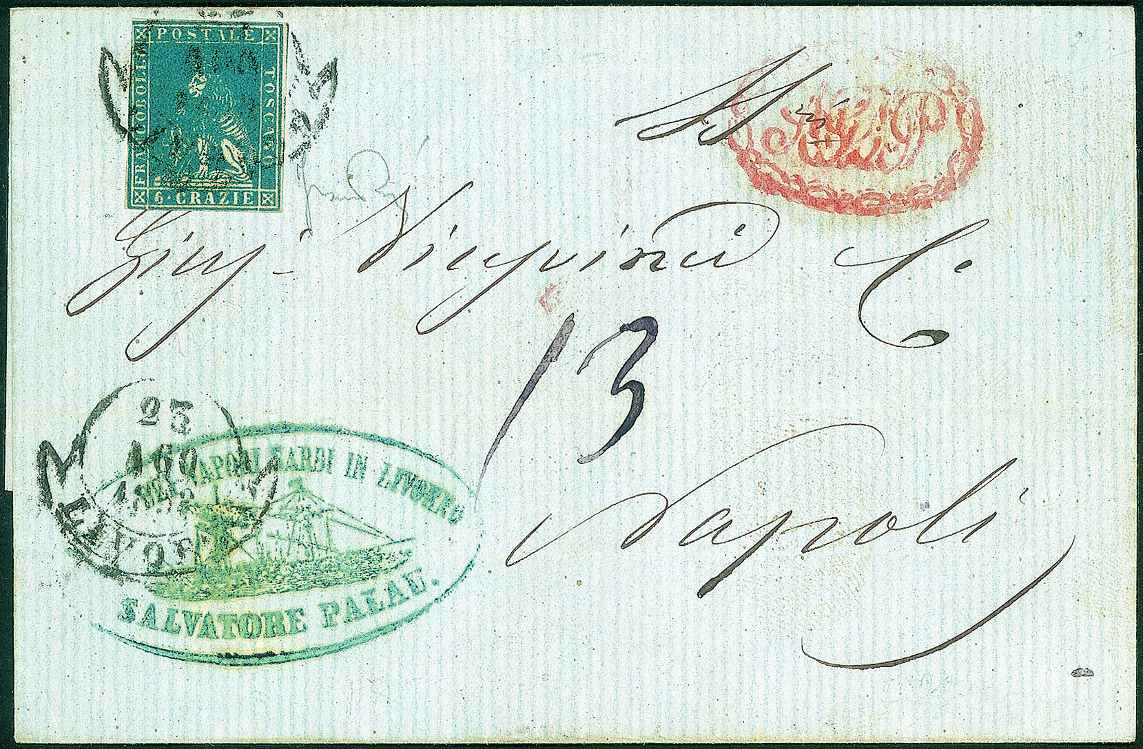 Lettera affrancata con 6 crazie (15) da Livorno 23 AGO.1858 per Napoli con bollo Mes. dei vapori sardi in Livorno - Salvatore Palau