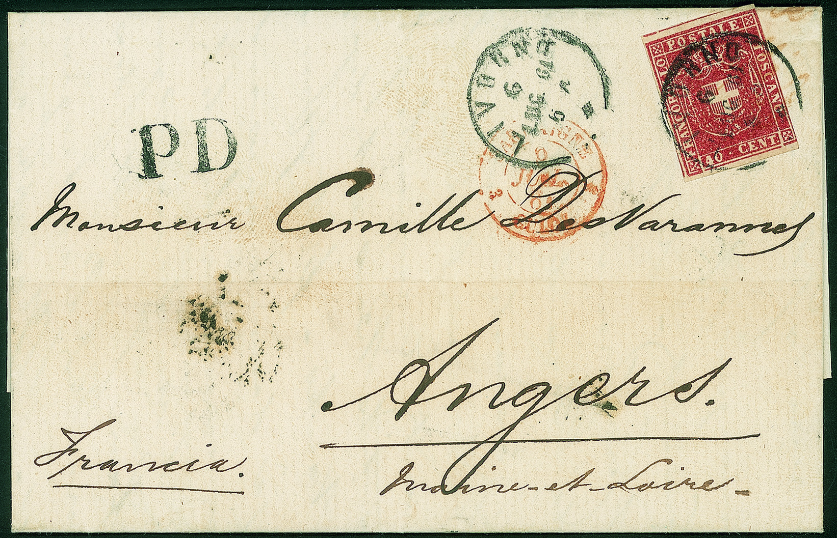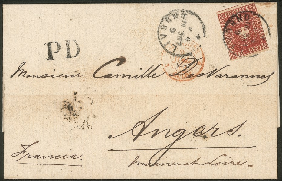 Lettera affrancata con 40 cent carminio (21 cat.3250) da Livorno 6 LUG.61 per Angers - bella e molto fresca