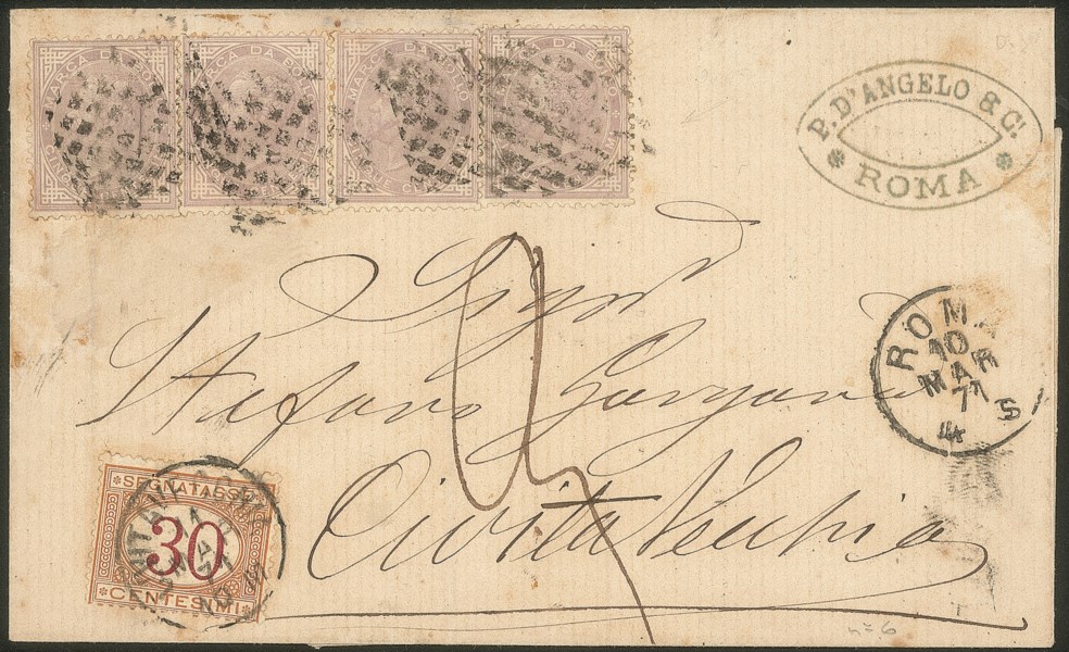 Marca da Bollo annullati con il muto a rombi da Roma 10 MAR 71 per Civitavecchia - tassata con 30 cent segnatasse - rara
