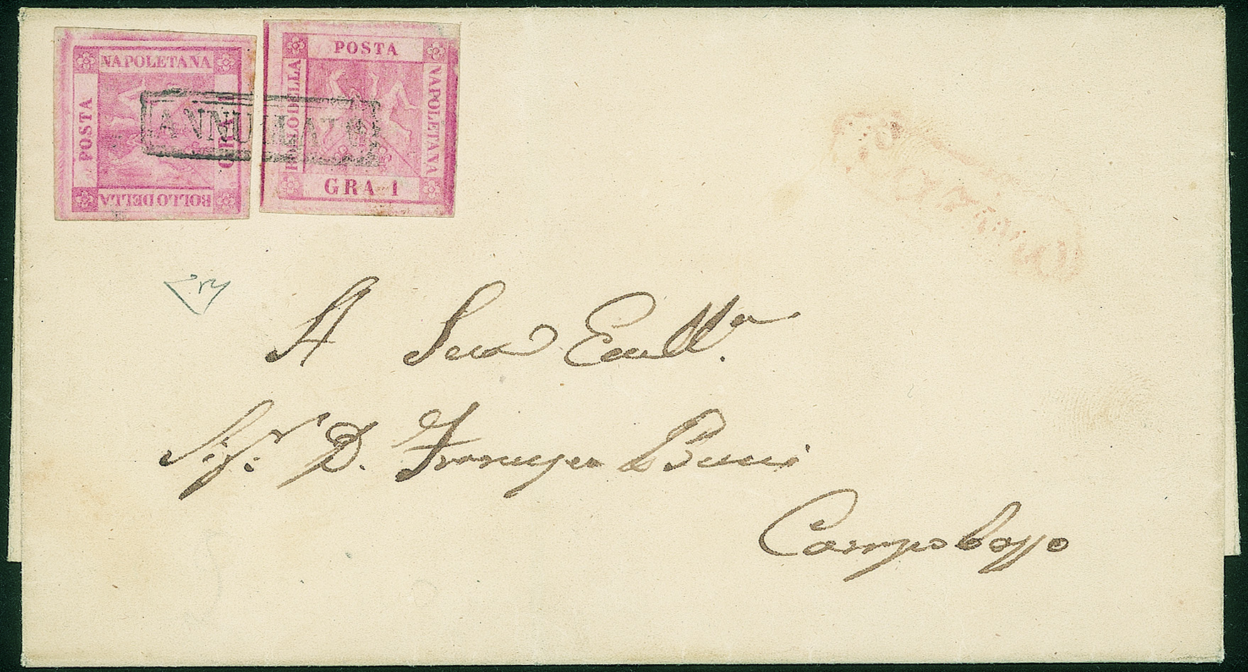Affrancata con due 1 grano carminio I tavola (3c) da Larino a Campobasso cert Enzo Diena