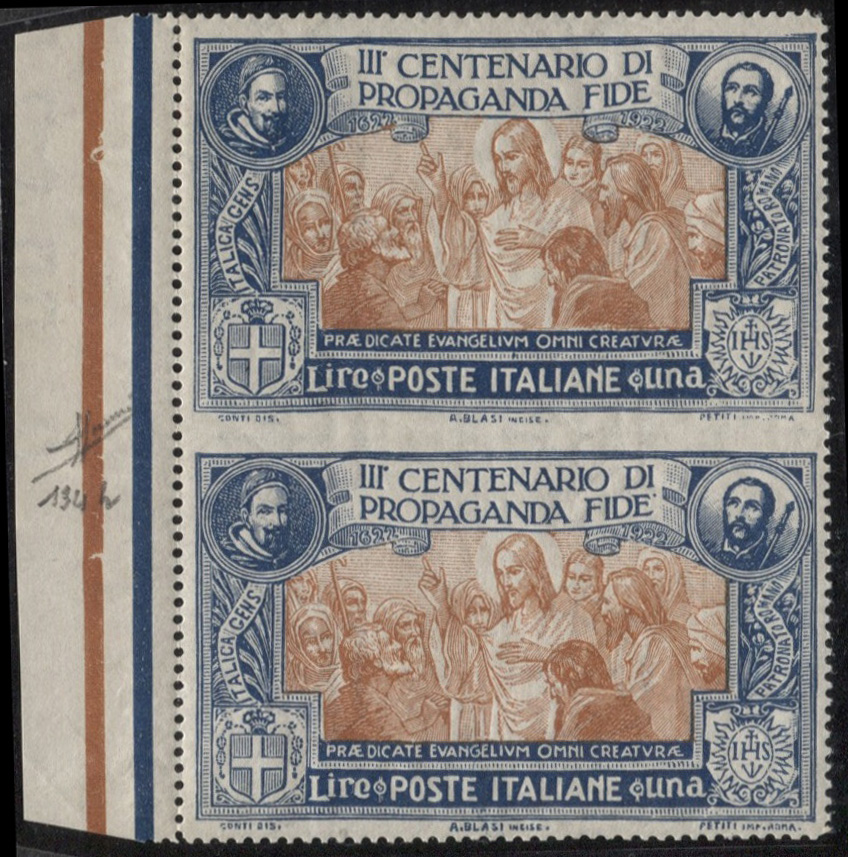 1923 Regno - Propaganda Fide 1 lira azzurra e arancio - coppia verticale non dentellata in mezzo - cert. Sorani - (134h)