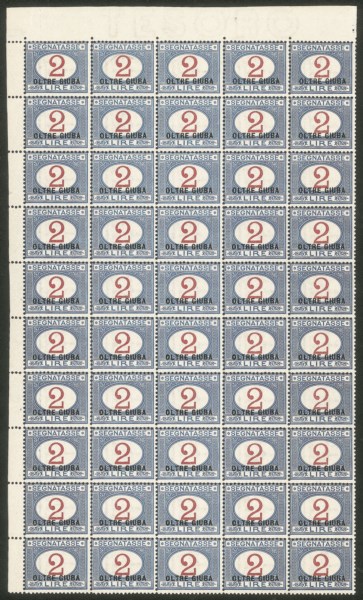 2 lire segnatasse soprastampati (9) - blocco di 50 esemplari angolo di foglio alto a sinistra - gomma integra