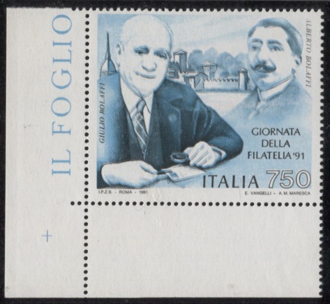 1991 Repubblica - 750 lire Giornata della Filatelia con la sola stampa del colore azzurro - francobollo con angolo di foglio - cert. oro Raybaudi - (Specializzato 1612 Aa)
