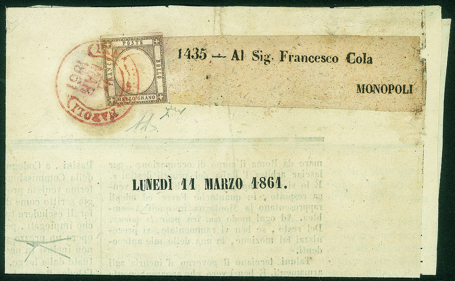 Perfetto - isolato su fascetta con testata del giornale Il nazionale da Napoli 11 MAR 1861 a Monopoli - prima data finora nota del 1/2 grano che anticipa quella del catalogo Sassone - rarità del settore - cert. Bottacchi