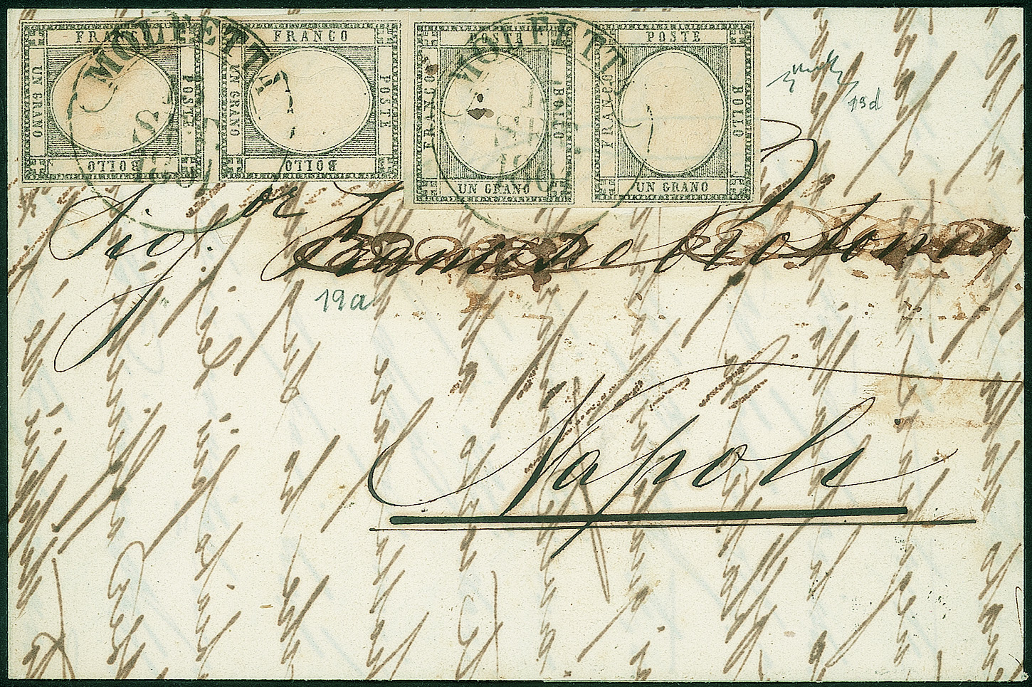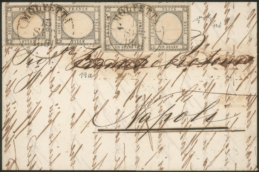 (leggermente intaccata in alto a destra) + una orizzontale (perfetta) del 1 grano grigio nero (19a) da Molfetta 13 SETT 1861 a Napoli - firma Chiavarello