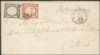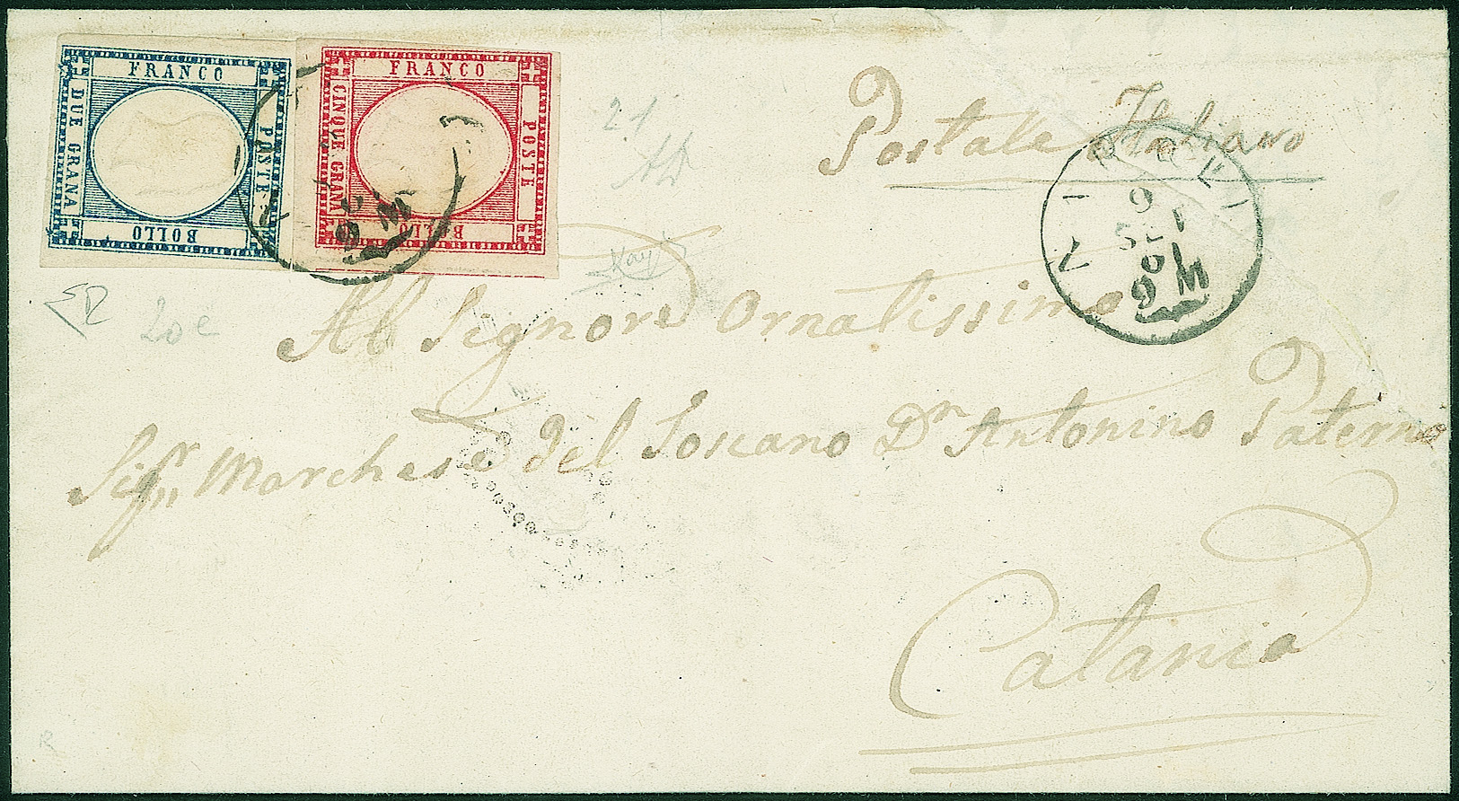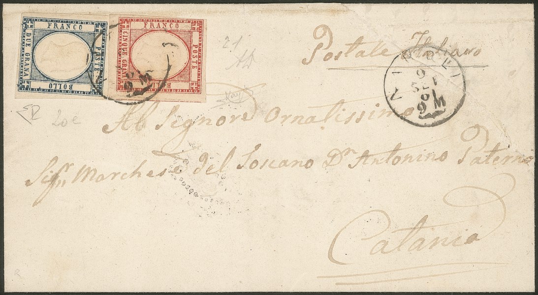 Antichi Stati Italiani - Napoli - Lettera affrancata con 5 grana rosso carminio + 2 grana indaco esemplare con due ritocchi (20e + 21 cat.1350)