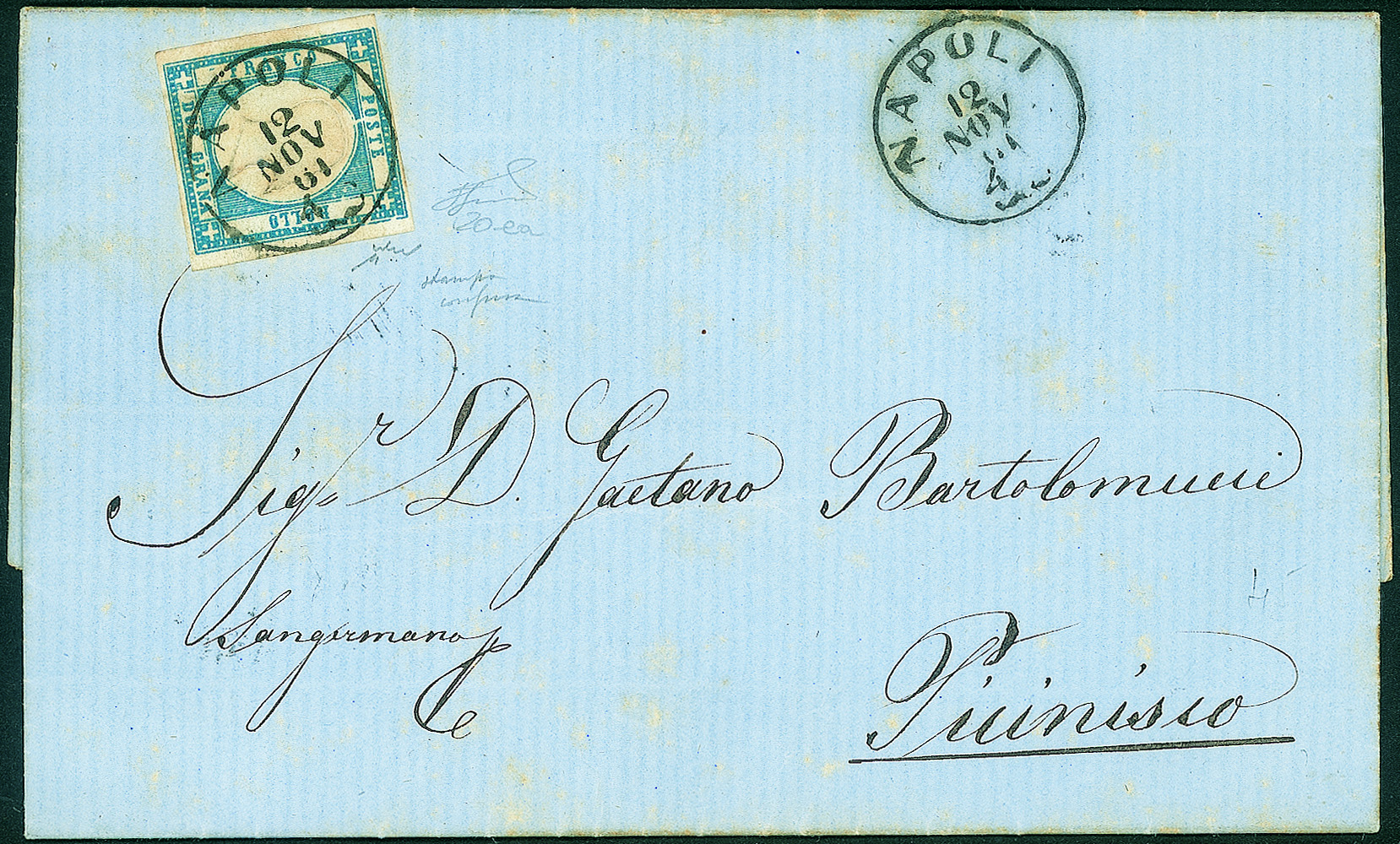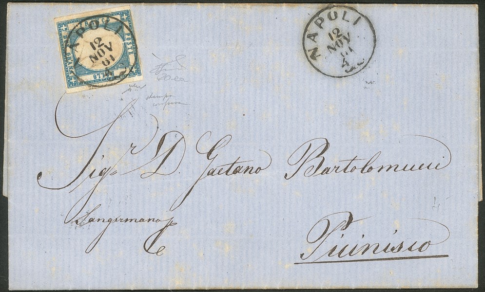 2 grana azzurro oltremare vivo (20ea) - perfetto - su lettera da Napoli 12 NOV 61 a Picinisio - raro colore - firma Chiavarello