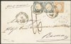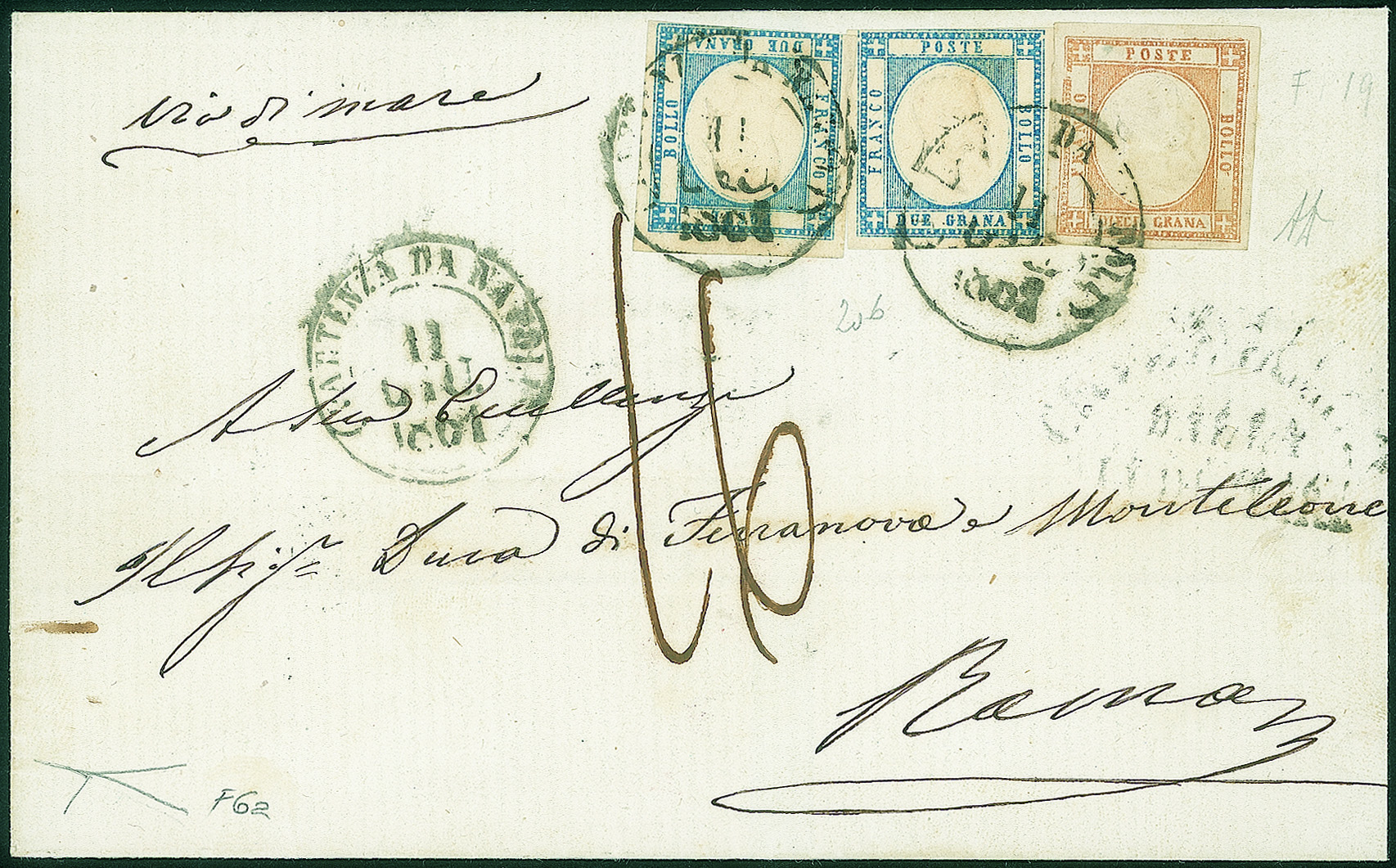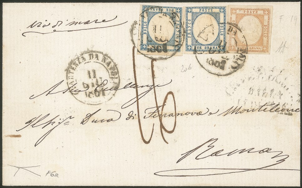 Sovracoperta di lettera affrancata con 10 grana arancio falso per posta del I tipo effige B perfetto e ben marginato + due 2 grana azzurro (F6a + 20b) da Napoli 11 GIU 1861 a Roma - bollo via di mare di Civitavecchia - tassata 16 bajocchi - rara - Cert. Bottacchi