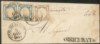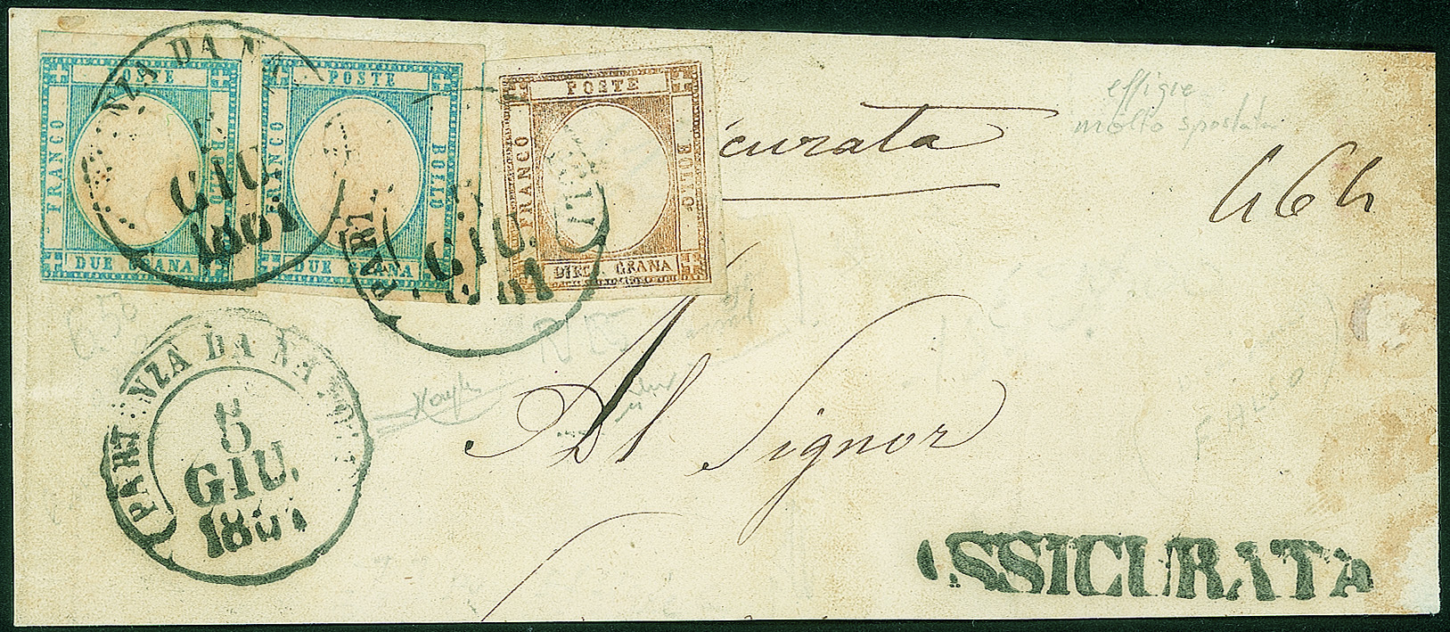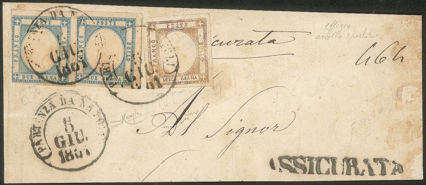 + due esemplari del 2 grana azzurro (leggermente corti a sinistra) su ampio frammento di lettera assicurata da Napoli 5 GIU.1861 - firme Raybaudi + Chiavarello