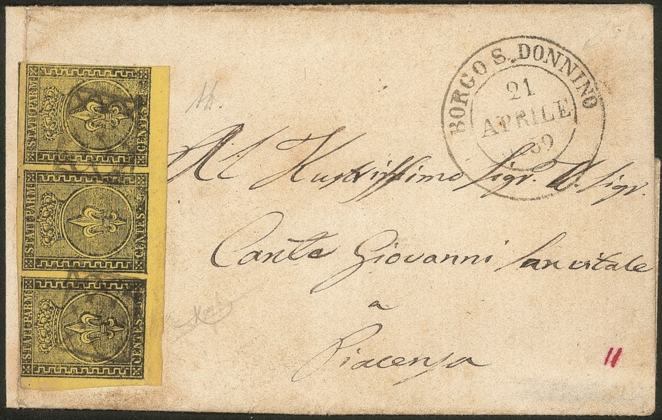 Angolo di foglio (1) con annullo a griglietta + doppio cerchio Borgo S.Donnino 21 APRILE 1859 per Piacenza - firma AD + cert. Raybaudi