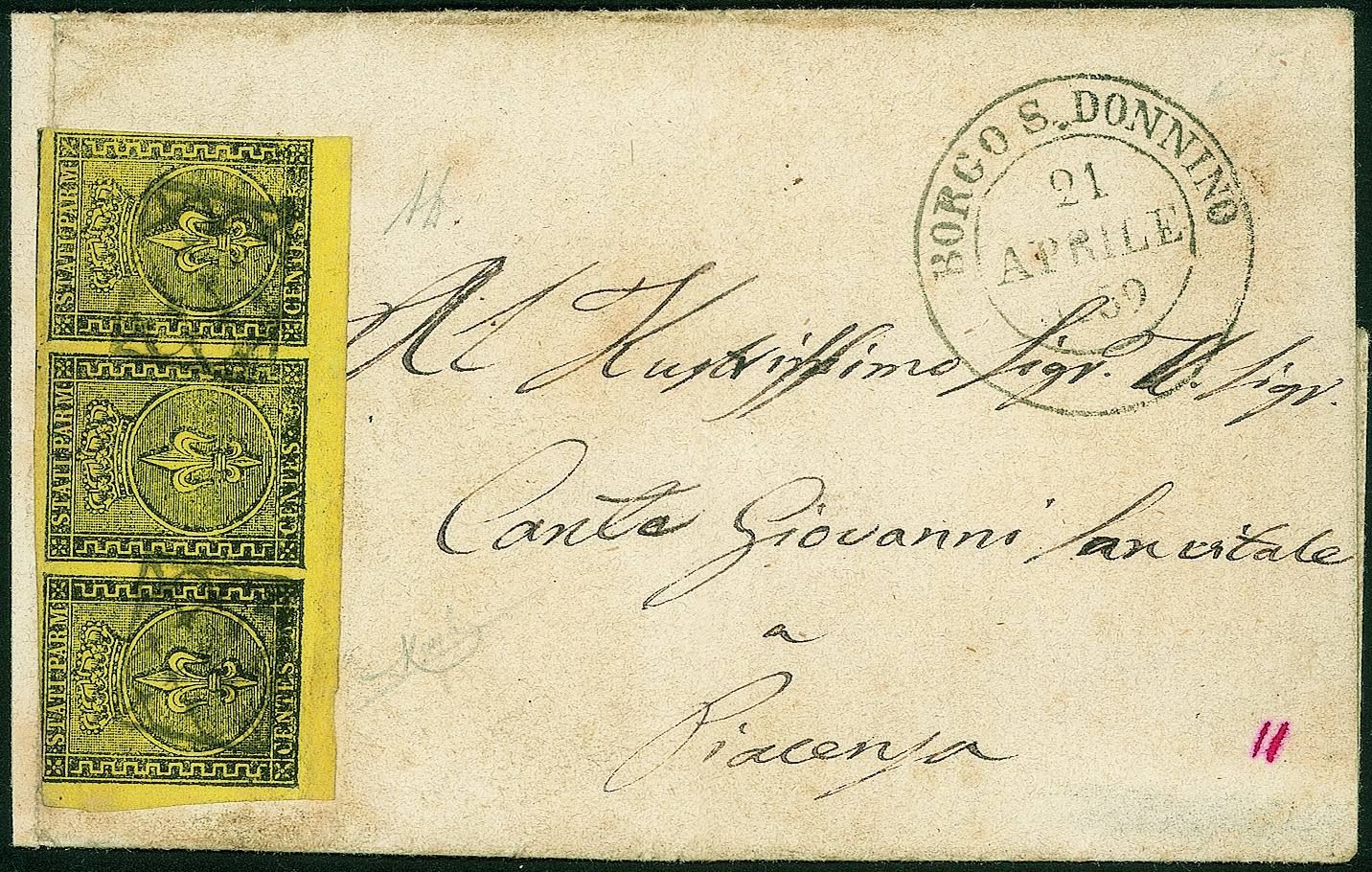 Antichi Stati Italiani - Parma - Lettera affrancata con striscia orizzontale di tre del 5 cent giallo arancio