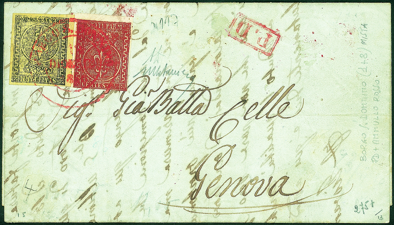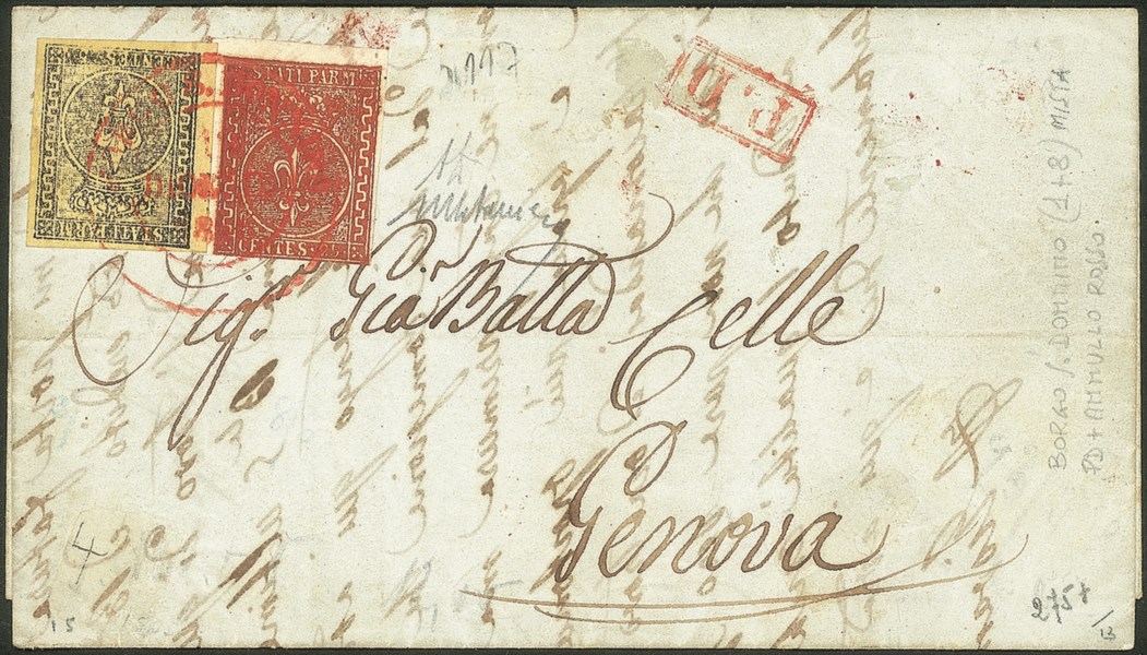Con annullo rosso Borgo S.Donnino 12 Dicembre 1856 + bollo in cartella rosso P.D. per Genova - cert. M.Catania